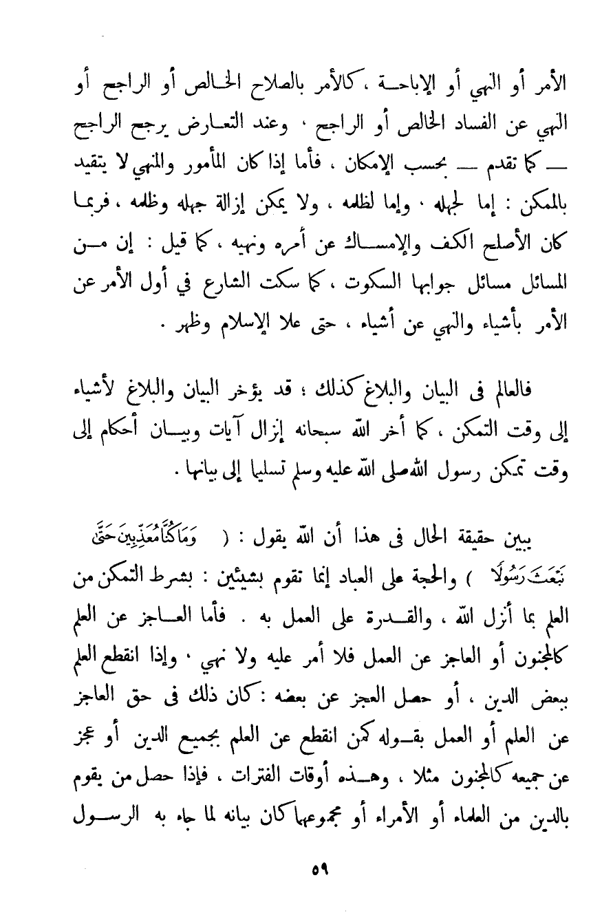 الْأَمْرِ أَوْ النَّهْيِ أَوْ الْإِبَاحَةِ كَالْأَمْرِ بِالصَّلَاحِ الْخَالِصِ أَوْ الرَّاجِحِ أَوْ النَّهْيِ عَنْ الْفَسَادِ الْخَالِصِ أَوْ الرَّاجِحِ وَعِنْدَ التَّعَارُضِ يُرَجَّحُ الرَّاجِحُ - كَمَا تَقَدَّمَ - بِحَسَبِ الْإِمْكَانِ فَأَمَّا إذَا كَانَ الْمَأْمُورُ وَالْمَنْهِيُّ لَا يَتَقَيَّدُ بِالْمُمْكِنِ: إمَّا لِجَهْلِهِ وَإِمَّا لِظُلْمِهِ وَلَا يُمْكِنُ إزَالَةُ جَهْلِهِ وَظُلْمِهِ فَرُبَّمَا كَانَ الْأَصْلَحُ الْكَفَّ وَالْإِمْسَاكَ عَنْ أَمْرِهِ وَنَهْيِهِ كَمَا قِيلَ: إنَّ مِنْ الْمَسَائِلِ مَسَائِلَ جَوَابُهَا السُّكُوتُ كَمَا سَكَتَ الشَّارِعُ فِي أَوَّلِ الْأَمْرِ عَنْ الْأَمْرِ بِأَشْيَاءَ وَالنَّهْيِ عَنْ أَشْيَاءَ حَتَّى عَلَا الْإِسْلَامُ وَظَهَرَ. فَالْعَالِمُ فِي الْبَيَانِ وَالْبَلَاغِ كَذَلِكَ؛ قَدْ يُؤَخِّرُ الْبَيَانَ وَالْبَلَاغَ لِأَشْيَاءَ إلَى وَقْتِ التَّمَكُّنِ كَمَا أَخَّرَ اللَّهُ سُبْحَانَهُ إنْزَالَ آيَاتٍ وَبَيَانَ أَحْكَامٍ إلَى وَقْتِ تَمَكُّنِ رَسُولِ اللَّهِ صَلَّى اللَّهُ عَلَيْهِ وَسَلَّمَ تَسْلِيمًا إلَى بَيَانِهَا. يُبَيِّنُ حَقِيقَةَ الْحَالِ فِي هَذَا أَنَّ اللَّهَ يَقُولُ: {وَمَا كُنَّا مُعَذِّبِينَ حَتَّى نَبْعَثَ رَسُولًا} وَالْحُجَّةُ عَلَى الْعِبَادِ إنَّمَا تَقُومُ بِشَيْئَيْنِ: بِشَرْطِ التَّمَكُّنِ مِنْ الْعِلْمِ بِمَا أَنْزَلَ اللَّهُ وَالْقُدْرَةِ عَلَى الْعَمَلِ بِهِ. فَأَمَّا الْعَاجِزُ عَنْ الْعِلْمِ كَالْمَجْنُونِ أَوْ الْعَاجِزِ عَنْ الْعَمَلِ فَلَا أَمْرَ عَلَيْهِ وَلَا نَهْيَ وَإِذَا انْقَطَعَ الْعِلْمُ بِبَعْضِ الدِّينِ أَوْ حَصَلَ الْعَجْزُ عَنْ بَعْضِهِ: كَانَ ذَلِكَ فِي حَقِّ الْعَاجِزِ عَنْ الْعِلْمِ أَوْ الْعَمَلِ بِقَوْلِهِ كَمَنْ انْقَطَعَ عَنْ الْعِلْمِ بِجَمِيعِ الدِّينِ أَوْ عَجَزَ عَنْ جَمِيعِهِ كَالْجُنُونِ مَثَلًا وَهَذِهِ أَوْقَاتُ الْفَتَرَاتِ فَإِذَا حَصَلَ مَنْ يَقُومُ بِالدِّينِ مِنْ الْعُلَمَاءِ أَوْ الْأُمَرَاءِ أَوْ مَجْمُوعِهِمَا كَانَ بَيَانُهُ لِمَا جَاءَ بِهِ الرَّسُولُ
