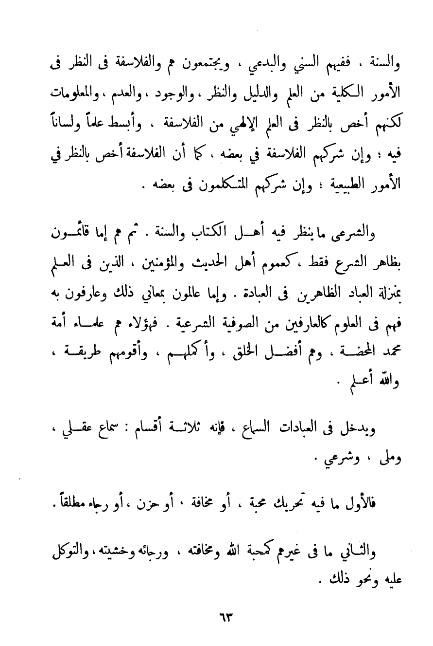 وَالسُّنَّةِ فَفِيهِمْ السُّنِّيُّ وَالْبِدْعِيُّ وَيَجْتَمِعُونَ هُمْ وَالْفَلَاسِفَةُ فِي النَّظَرِ فِي الْأُمُورِ الْكُلِّيَّةِ مِنْ الْعِلْمِ وَالدَّلِيلِ وَالنَّظَرِ وَالْوُجُودِ وَالْعَدَمِ وَالْمَعْلُومَاتِ لَكِنَّهُمْ أَخَصُّ بِالنَّظَرِ فِي الْعِلْمِ الْإِلَهِيِّ مِنْ الْفَلَاسِفَةِ وَأَبْسَطُ عِلْمًا وَلِسَانًا فِيهِ؛ وَإِنْ شَرَكَهُمْ الْفَلَاسِفَةُ فِي بَعْضِهِ كَمَا أَنَّ الْفَلَاسِفَةَ أَخَصُّ بِالنَّظَرِ فِي الْأُمُورِ الطَّبِيعِيَّةِ؛ وَإِنْ شَرَكَهُمْ الْمُتَكَلِّمُونَ فِي بَعْضِهِ. وَالشَّرْعِيُّ مَا يَنْظُرُ فِيهِ أَهْلُ الْكِتَابِ وَالسُّنَّةِ. ثُمَّ هُمْ إمَّا قَائِمُونَ بِظَاهِرِ أَسْرَعَ فَقَطْ كَعُمُومِ أَهْلِ الْحَدِيثِ وَالْمُؤْمِنِينَ الَّذِينَ فِي الْعِلْمِ بِمَنْزِلَةِ الْعِبَادِ الظَّاهِرِينَ فِي الْعِبَادَةِ. وَإِمَّا عَالِمُونَ بِمَعَانِي ذَلِكَ وَعَارِفُونَ بِهِ فَهُمْ فِي الْعُلُومِ كَالْعَارِفِينَ مِنْ الصُّوفِيَّةِ الشَّرْعِيَّةِ. فَهَؤُلَاءِ هُمْ عُلَمَاءُ أُمَّةِ مُحَمَّدٍ الْمَحْضَةِ وَهُمْ أَفْضَلُ الْخَلْقِ وَأَكْمَلُهُمْ وَأَقْوَمُهُمْ طَرِيقَةً وَاَللَّهُ أَعْلَمُ. وَيَدْخُلُ فِي الْعِبَادَاتِ السَّمَاعُ فَإِنَّهُ ثَلَاثَةُ أَقْسَامٍ: سَمَاعٌ عَقْلِيٌّ وملي. وَشَرْعِيٌّ. فَالْأَوَّلُ مَا فِيهِ تَحْرِيكُ مَحَبَّةٍ أَوْ مَخَافَةٍ أَوْ حُزْنٍ أَوْ رَجَاءٍ مُطْلَقًا. وَالثَّانِي مَا فِي غَيْرِهِمْ كَمَحَبَّةِ اللَّهِ وَمَخَافَتِهِ وَرَجَائِهِ وَخَشْيَتِهِ وَالتَّوَكُّلِ عَلَيْهِ وَنَحْوِ ذَلِكَ.