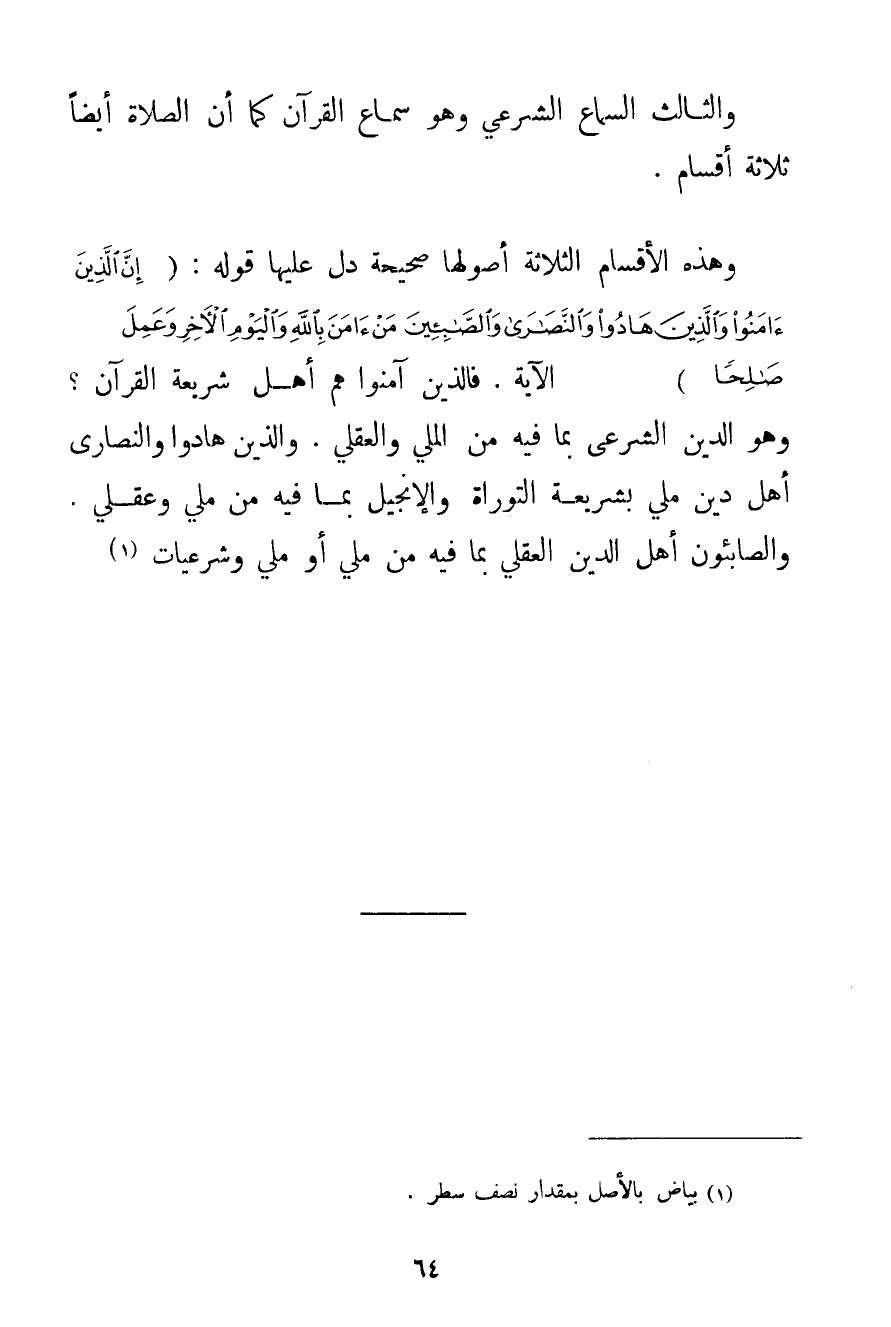 وَالثَّالِثُ السَّمَاعُ الشَّرْعِيُّ وَهُوَ سَمَاعُ الْقُرْآنِ كَمَا أَنَّ الصَّلَاةَ أَيْضًا ثَلَاثَةُ أَقْسَامٍ. وَهَذِهِ الْأَقْسَامُ الثَّلَاثَةُ أُصُولُهَا صَحِيحَةٌ دَلَّ عَلَيْهَا قَوْلُهُ: {إنَّ الَّذِينَ آمَنُوا وَالَّذِينَ هَادُوا وَالنَّصَارَى وَالصَّابِئِينَ مَنْ آمَنَ بِاللَّهِ وَالْيَوْمِ الْآخِرِ وَعَمِلَ صَالِحًا} الْآيَةَ. فَاَلَّذِينَ آمَنُوا هُمْ أَهْلُ شَرِيعَةِ الْقُرْآنِ؟ وَهُوَ الدِّينُ الشَّرْعِيُّ بِمَا فِيهِ مِنْ الْمِلِّي وَالْعَقْلِيِّ. وَاَلَّذِينَ هَادُوا وَالنَّصَارَى أَهْلُ دِينٍ ملي بِشَرِيعَةِ التَّوْرَاةِ وَالْإِنْجِيلِ بِمَا فِيهِ مِنْ ملي وَعَقْلِيٍّ وَالصَّابِئُونَ أَهْلُ الدِّينِ الْعَقْلِيِّ بِمَا فِيهِ مِنْ ملي أَوْ ملي وَشَرْعِيَّاتٍ (1) .