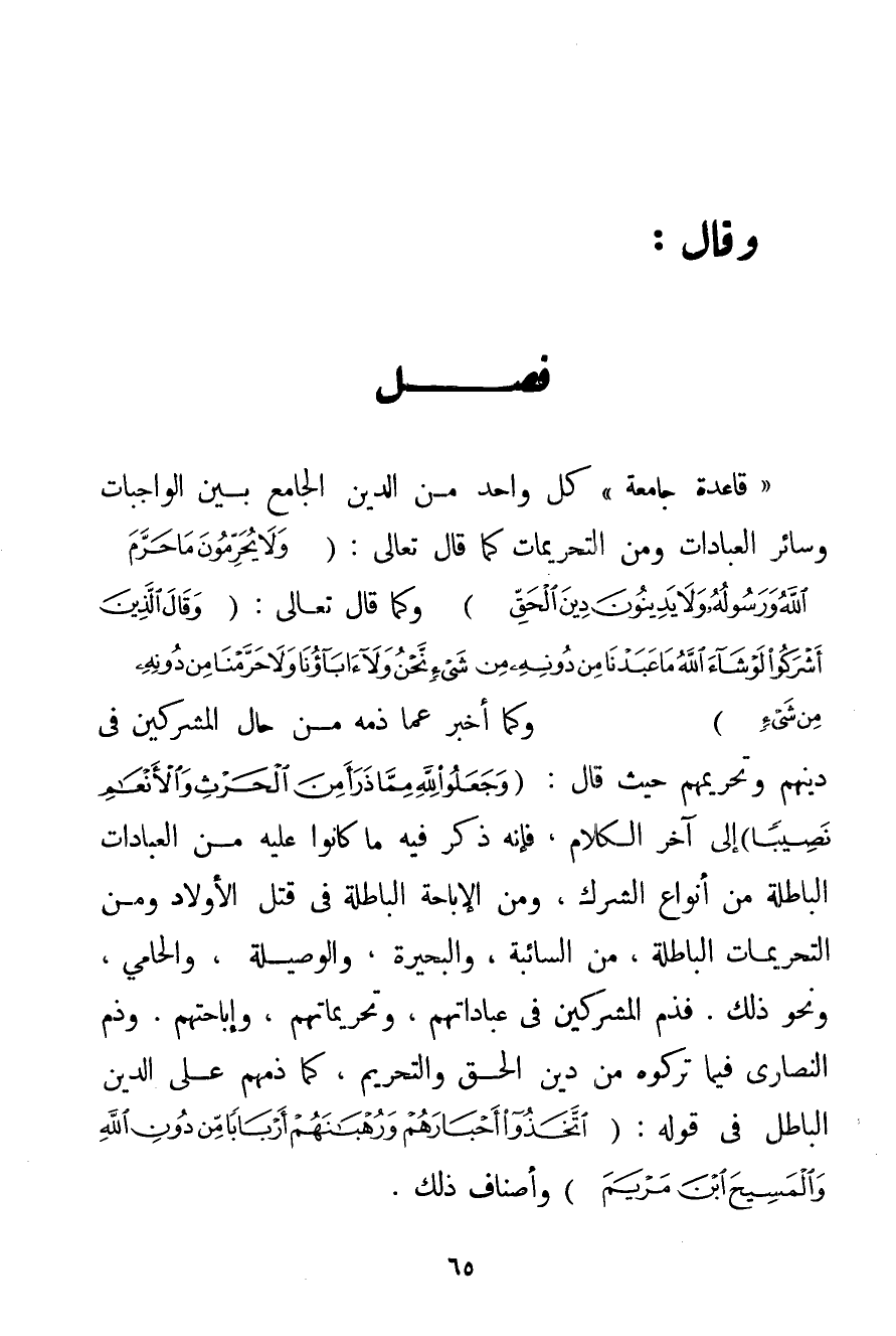 " قَاعِدَةٌ جَامِعَةٌ " كُلُّ وَاحِدٍ مِنْ الدِّينِ الْجَامِعِ بَيْنَ الْوَاجِبَاتِ وَسَائِرِ الْعِبَادَاتِ وَمِنْ التَّحْرِيمَاتِ كَمَا قَالَ تَعَالَى: {وَلَا يُحَرِّمُونَ مَا حَرَّمَ اللَّهُ وَرَسُولُهُ وَلَا يَدِينُونَ دِينَ الْحَقِّ} وَكَمَا قَالَ تَعَالَى: {وَقَالَ الَّذِينَ أَشْرَكُوا لَوْ شَاءَ اللَّهُ مَا عَبَدْنَا مِنْ دُونِهِ مِنْ شَيْءٍ نَحْنُ وَلَا آبَاؤُنَا وَلَا حَرَّمْنَا مِنْ دُونِهِ مِنْ شَيْءٍ} وَكَمَا أَخْبَرَ عَمَّا ذَمَّهُ مِنْ حَالِ الْمُشْرِكِينَ فِي دِينِهِمْ وَتَحْرِيمِهِمْ حَيْثُ قَالَ: {وَجَعَلُوا لِلَّهِ مِمَّا ذَرَأَ مِنَ الْحَرْثِ وَالْأَنْعَامِ نَصِيبًا} إلَى آخِرِ الْكَلَامِ فَإِنَّهُ ذَكَرَ فِيهِ مَا كَانُوا عَلَيْهِ مِنْ الْعِبَادَاتِ الْبَاطِلَةِ مِنْ أَنْوَاعِ الشِّرْكِ وَمِنْ الْإِبَاحَةِ الْبَاطِلَةِ فِي قَتْلِ الْأَوْلَادِ وَمِنْ التَّحْرِيمَاتِ الْبَاطِلَةِ مِنْ السَّائِبَةِ وَالْبَحِيرَةِ وَالْوَصِيلَةِ والحام وَنَحْوِ ذَلِكَ. فَذَمَّ الْمُشْرِكِينَ فِي عِبَادَاتِهِمْ وَتَحْرِيمَاتِهِمْ وَإِبَاحَتِهِمْ. وَذَمَّ النَّصَارَى فِيمَا تَرَكُوهُ مِنْ دِينِ الْحَقِّ وَالتَّحْرِيمِ كَمَا ذَمَّهُمْ عَلَى الدِّينِ الْبَاطِلِ فِي قَوْلِهِ: {اتَّخَذُوا أَحْبَارَهُمْ وَرُهْبَانَهُمْ أَرْبَابًا مِنْ دُونِ اللَّهِ وَالْمَسِيحَ ابْنَ مَرْيَمَ} وَأَصْنَافَ ذَلِكَ.