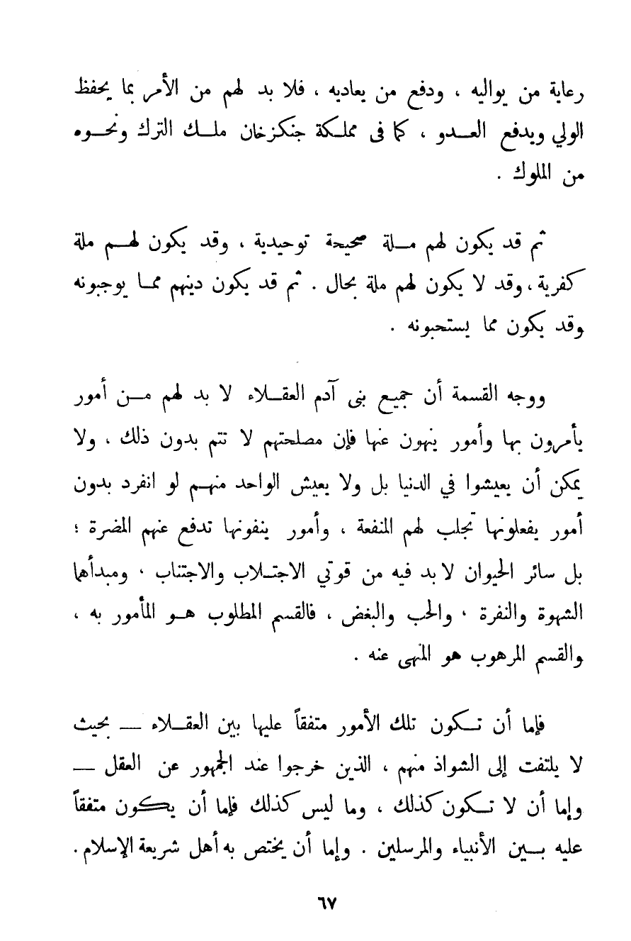 رِعَايَةَ مَنْ يُوَالِيهِ وَدَفْعَ مَنْ يُعَادِيهِ فَلَا بُدَّ لَهُمْ مِنْ الْأَمْرِ بِمَا يَحْفَظُ الْوَلِيَّ وَيَدْفَعُ الْعَدُوَّ كَمَا فِي مَمْلَكَةِ جنكيزخان مَلِكِ التُّرْكِ وَنَحْوِهِ مِنْ الْمُلُوكِ. ثُمَّ قَدْ يَكُونُ لَهُمْ مِلَّةٌ صَحِيحَةٌ تَوْحِيدِيَّةٌ وَقَدْ يَكُونُ لَهُمْ مِلَّةٌ كفرية وَقَدْ لَا يَكُونُ لَهُمْ مِلَّةٌ بِحَالِ. ثُمَّ قَدْ يَكُونُ دِينُهُمْ مِمَّا يُوجِبُونَهُ وَقَدْ يَكُونُ مِمَّا يَسْتَحِبُّونَهُ. وَوَجْهُ الْقِسْمَةِ أَنَّ جَمِيعَ بَنِي آدَمَ الْعُقَلَاءِ لَا بُدَّ لَهُمْ مِنْ أُمُورٍ يُؤْمَرُونَ بِهَا وَأُمُورٍ يُنْهَوْنَ عَنْهَا فَإِنَّ مَصْلَحَتَهُمْ لَا تَتِمُّ بِدُونِ ذَلِكَ وَلَا يُمْكِنُ أَنْ يَعِيشُوا فِي الدُّنْيَا بَلْ وَلَا يَعِيشُ الْوَاحِدُ مِنْهُمْ لَوْ انْفَرَدَ بِدُونِ أُمُورٍ يَفْعَلُونَهَا تَجْلِبُ لَهُمْ الْمَنْفَعَةَ وَأُمُورٍ يَنْفُونَهَا تَدْفَعُ عَنْهُمْ الْمَضَرَّةَ؛ بَلْ سَائِرُ الْحَيَوَانِ لَا بُدَّ فِيهِ مِنْ قُوَّتَيْ الِاجْتِلَابِ وَالِاجْتِنَابِ وَمَبْدَؤُهُمَا الشَّهْوَةُ وَالنَّفْرَةُ وَالْحُبُّ وَالْبُغْضُ فَالْقِسْمُ الْمَطْلُوبُ هُوَ الْمَأْمُورُ بِهِ وَالْقِسْمُ الْمَرْهُوبُ هُوَ الْمَنْهِيُّ عَنْهُ. فَإِمَّا أَنْ تَكُونَ تِلْكَ الْأُمُورُ مُتَّفَقًا عَلَيْهَا بَيْنَ الْعُقَلَاءِ - بِحَيْثُ لَا يُلْتَفَتُ إلَى الشَّوَاذِّ مِنْهُمْ الَّذِينَ خَرَجُوا عِنْدَ الْجُمْهُورِ عَنْ الْعَقْلِ - وَإِمَّا أَنْ لَا تَكُونُ كَذَلِكَ وَمَا لَيْسَ كَذَلِكَ فَإِمَّا أَنْ يَكُونَ مُتَّفَقًا عَلَيْهِ بَيْنَ الْأَنْبِيَاءِ وَالْمُرْسَلِينَ. وَإِمَّا أَنْ يَخْتَصَّ بِهِ أَهْلُ شَرِيعَةِ الْإِسْلَامِ.