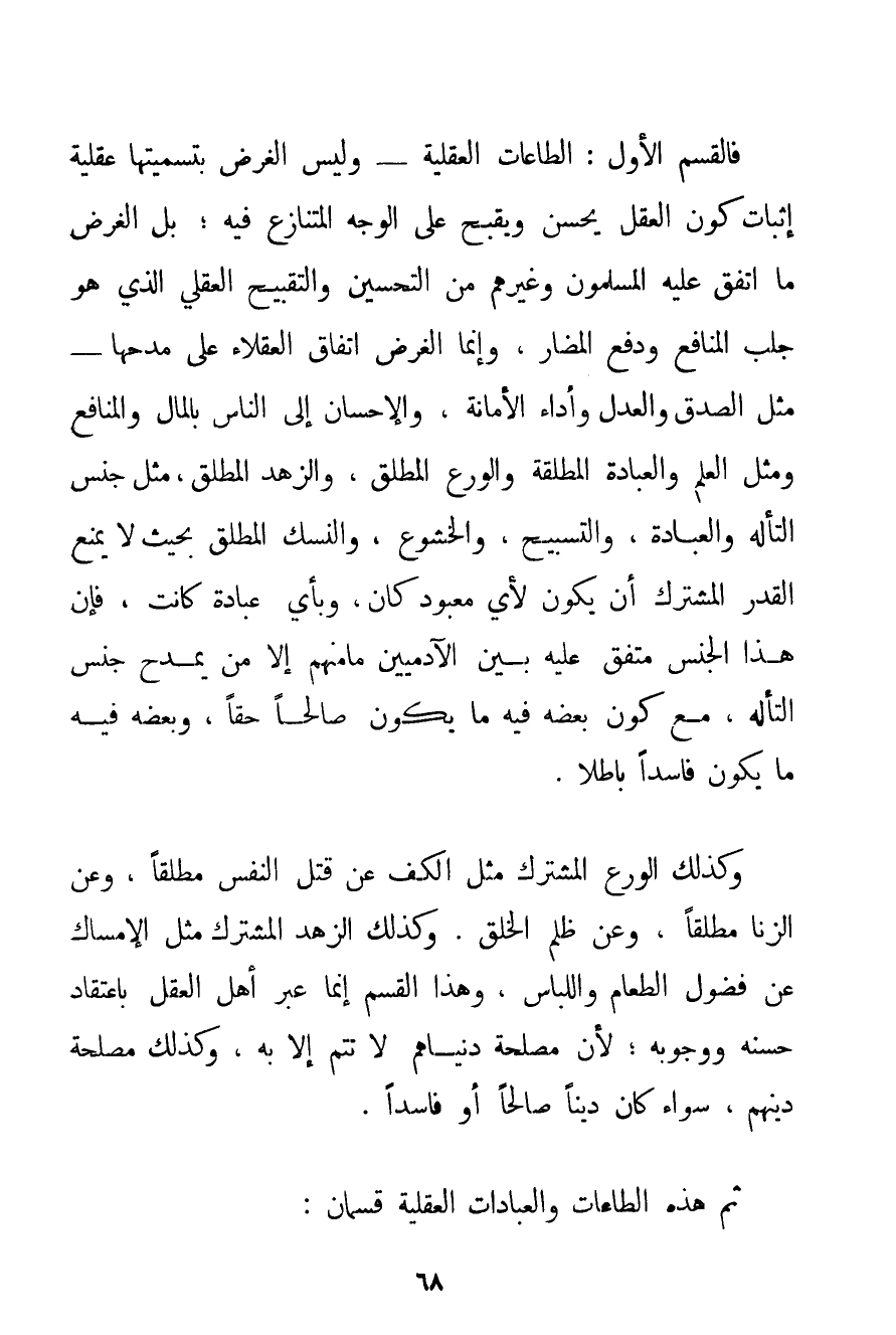 فَالْقِسْمُ الْأَوَّلُ: الطَّاعَاتُ الْعَقْلِيَّةُ - وَلَيْسَ الْغَرَضُ بِتَسْمِيَتِهَا عَقْلِيَّةً إثْبَاتَ كَوْنِ الْعَقْلِ يُحَسِّنُ وَيُقَبِّحُ عَلَى الْوَجْهِ الْمُتَنَازَعِ فِيهِ؛ بَلْ الْغَرَضُ مَا اتَّفَقَ عَلَيْهِ الْمُسْلِمُونَ وَغَيْرُهُمْ مِنْ التَّحْسِينِ وَالتَّقْبِيحِ الْعَقْلِيِّ الَّذِي هُوَ جَلْبُ الْمَنَافِعِ وَدَفْعُ الْمَضَارِّ وَإِنَّمَا الْغَرَضُ اتِّفَاقُ الْعُقَلَاءِ عَلَى مَدْحِهَا - مِثْلَ الصِّدْقِ وَالْعَدْلِ وَأَدَاءِ الْأَمَانَةِ وَالْإِحْسَانِ إلَى النَّاسِ بِالْمَالِ وَالْمَنَافِعِ وَمِثْلَ الْعِلْمِ وَالْعِبَادَةِ الْمُطْلَقَةِ وَالْوَرَعِ الْمُطْلَقِ وَالزُّهْدِ الْمُطْلَقِ مِثْلَ جِنْسِ التَّأَلُّهِ وَالْعِبَادَةِ وَالتَّسْبِيحِ وَالْخُشُوعِ وَالنُّسُكِ الْمُطْبَقِ بِحَيْثُ لَا يَمْنَعُ الْقَدْرَ الْمُشْتَرَكَ أَنْ يَكُونَ لِأَيِّ مَعْبُودٍ كَانَ وَبِأَيِّ عِبَادَةٍ كَانَتْ فَإِنَّ هَذَا الْجِنْسَ مُتَّفَقٌ عَلَيْهِ بَيْنَ الْآدَمِيِّينَ مَا مِنْهُمْ إلَّا مَنْ يَمْدَحُ جِنْسَ التَّأَلُّهِ مَعَ كَوْنِ بَعْضِهِ فِيهِ مَا يَكُونُ صَالِحًا حَقًّا وَبَعْضُهُ فِيهِ مَا يَكُونُ فَاسِدًا بَاطِلًا. وَكَذَلِكَ الْوَرَعُ الْمُشْتَرَكُ مِثْلَ الْكَفِّ عَنْ قَتْلِ النَّفْسِ مُطْلَقًا وَعَنْ الزِّنَا مُطْلَقًا وَعَنْ ظُلْمِ الْخَلْقِ. وَكَذَلِكَ الزُّهْدُ الْمُشْتَرَكُ مِثْلَ الْإِمْسَاكِ عَنْ فُضُولِ الطَّعَامِ وَاللِّبَاسِ وَهَذَا الْقِسْمُ إنَّمَا عَبَّرَ أَهْلُ الْعَقْلِ بِاعْتِقَادِ حُسْنِهِ وَوُجُوبِهِ؛ لِأَنَّ مَصْلَحَةَ دُنْيَاهُمْ لَا تَتِمُّ إلَّا بِهِ وَكَذَلِكَ مَصْلَحَةُ دِينِهِمْ سَوَاءٌ كَانَ دِينًا صَالِحًا أَوْ فَاسِدًا. ثُمَّ هَذِهِ الطَّاعَاتُ وَالْعِبَادَاتُ الْعَقْلِيَّةُ قِسْمَانِ:
