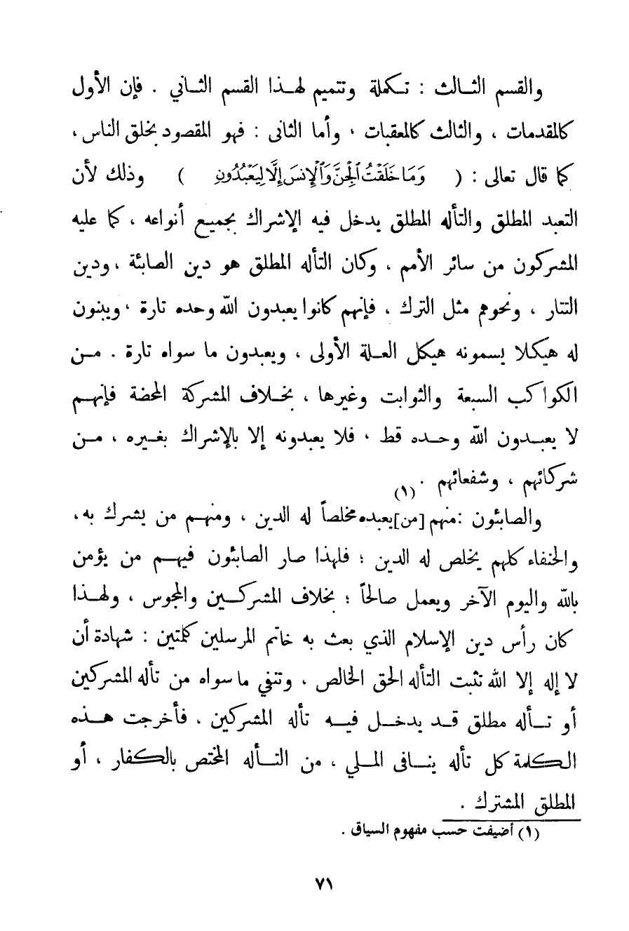 وَالْقِسْمُ الثَّالِثُ: تَكْمِلَةٌ وَتَتْمِيمٌ لِهَذَا الْقِسْمِ الثَّانِي. فَإِنَّ الْأَوَّلَ كَالْمُقَدِّمَاتِ وَالثَّالِثَ كَالْمُعَقِّبَاتِ وَأَمَّا الثَّانِي: فَهُوَ الْمَقْصُودُ بِخَلْقِ النَّاسِ كَمَا قَالَ تَعَالَى: {وَمَا خَلَقْتُ الْجِنَّ وَالْإِنْسَ إلَّا لِيَعْبُدُونِ} وَذَلِكَ لِأَنَّ التَّعَبُّدَ الْمُطْلَقَ وَالتَّأَلُّهَ الْمُطْلَقَ يَدْخُلُ فِيهِ الْإِشْرَاكُ بِجَمِيعِ أَنْوَاعِهِ كَمَا عَلَيْهِ الْمُشْرِكُونَ مِنْ سَائِرِ الْأُمَمِ وَكَانَ التَّأَلُّهُ الْمُطْلَقُ هُوَ دِينُ الصَّابِئَةِ وَدِينُ التَّتَارِ وَنَحْوِهِمْ مِثْلَ التُّرْكِ فَإِنَّهُمْ كَانُوا يَعْبُدُونَ اللَّهَ وَحْدَهُ تَارَةً وَيَبْنُونَ لَهُ هَيْكَلًا يُسَمُّونَهُ هَيْكَلَ الْعِلَّةِ الْأُولَى وَيَعْبُدُونَ مَا سِوَاهُ تَارَةً مِنْ الْكَوَاكِبِ السَّبْعَةِ وَالثَّوَابِتِ وَغَيْرِهَا بِخِلَافِ الْمُشْرِكَةِ الْمَحْضَةِ فَإِنَّهُمْ لَا يَعْبُدُونَ اللَّهَ وَحْدَهُ قَطُّ فَلَا يَعْبُدُونَهُ إلَّا بِالْإِشْرَاكِ بِغَيْرِهِ مِنْ شُرَكَائِهِمْ وَشُفَعَائِهِمْ. وَالصَّابِئُونَ: مِنْهُمْ مَنْ يَعْبُدُهُ مُخْلِصًا لَهُ الدِّينَ وَمِنْهُمْ مَنْ يُشْرِكُ بِهِ وَالْحُنَفَاءُ كُلُّهُمْ يُخْلِصُ لَهُ الدِّينَ؛ فَلِهَذَا صَارَ الصَّابِئُونَ فِيهِمْ مَنْ يُؤْمِنُ بِاَللَّهِ وَالْيَوْمِ الْآخِرِ وَيَعْمَلُ صَالِحًا؛ بِخِلَافِ الْمُشْرِكِينَ وَالْمَجُوس وَلِهَذَا كَانَ رَأْسُ دِينِ الْإِسْلَامِ الَّذِي بُعِثَ بِهِ خَاتَمُ الْمُرْسَلِينَ كَلِمَتَيْنِ: شَهَادَةُ أَنْ لَا إلَهَ إلَّا اللَّهُ تُثْبِتُ التَّأَلُّهَ الْحَقَّ الْخَالِصَ وَتَنْفِي مَا سِوَاهُ مِنْ تَأَلُّهِ الْمُشْرِكِينَ أَوْ تَأَلُّهٍ مُطْلَقٍ قَدْ يَدْخُلُ فِيهِ تَأَلُّهُ الْمُشْرِكِينَ فَأَخْرَجَتْ هَذِهِ الْكَلِمَةُ كُلَّ تَأَلُّهٍ يُنَافِي الْمِلِّي مِنْ التَّأَلُّهِ الْمُخْتَصِّ بِالْكُفَّارِ أَوْ الْمُطْلَقِ الْمُشْتَرَكِ.