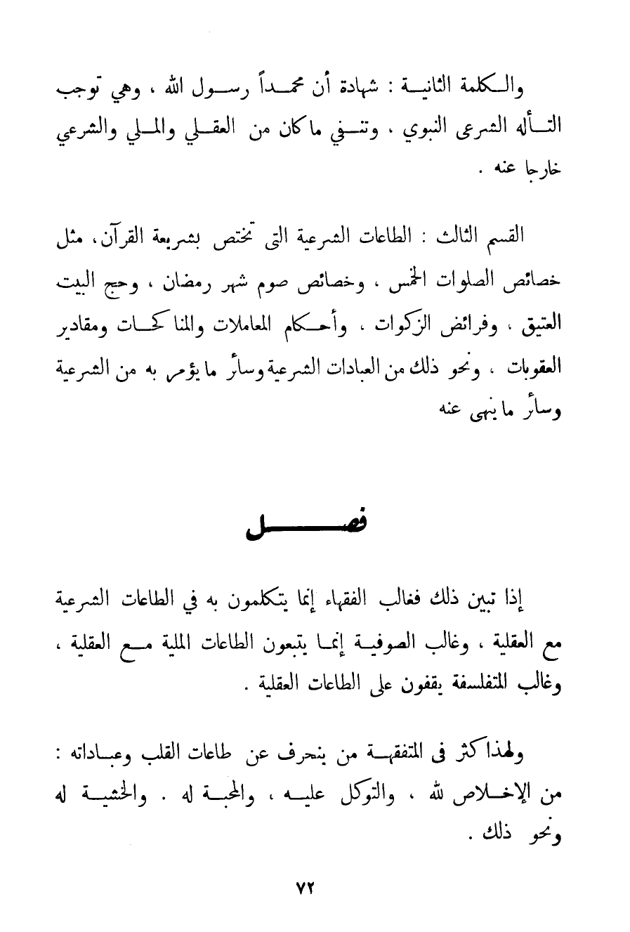إذَا تَبَيَّنَ ذَلِكَ فَغَالِبُ الْفُقَهَاءِ إنَّمَا يَتَكَلَّمُونَ بِهِ فِي الطَّاعَاتِ الشَّرْعِيَّةِ مَعَ الْعَقْلِيَّةِ وَغَالِبِ الصُّوفِيَّةِ إنَّمَا يَتَّبِعُونَ الطَّاعَاتِ الْمِلِّية مَعَ الْعَقْلِيَّةِ وَغَالِبُ الْمُتَفَلْسِفَةِ يَقِفُونَ عَلَى الطَّاعَاتِ الْعَقْلِيَّةِ. وَلِهَذَا كَثُرَ فِي الْمُتَفَقِّهَةِ مَنْ يَنْحَرِفُ عَنْ طَاعَاتِ الْقَلْبِ وَعِبَادَاتِهِ: مِنْ الْإِخْلَاصِ لِلَّهِ وَالتَّوَكُّلِ عَلَيْهِ وَالْمَحَبَّةِ لَهُ. وَالْخَشْيَةِ لَهُ وَنَحْوِ ذَلِكَ.