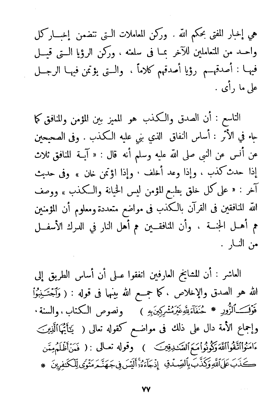 هِيَ إخْبَارُ الْمُفْتِي بِحُكْمِ اللَّهِ. وَرُكْنُ الْمُعَامَلَاتِ الَّتِي تَتَضَمَّنُ أَخْبَارَ كُلٍّ وَاحِدٍ مِنْ الْمُتَعَامِلَيْنِ لِلْآخَرِ بِمَا فِي سِلْعَتِهِ وَرُكْنُ الرُّؤْيَا الَّتِي قِيلَ فِيهَا: أَصْدَقُهُمْ رُؤْيَا أَصْدَقُهُمْ كَلَامًا وَاَلَّتِي يُؤْتَمَنُ فِيهَا الرَّجُلُ عَلَى مَا رَأَى. التَّاسِعُ: أَنَّ الصِّدْقَ وَالْكَذِبَ هُوَ الْمُمَيِّزُ بَيْنَ الْمُؤْمِنِ وَالْمُنَافِقِ كَمَا جَاءَ فِي الْأَثَرِ: أَسَاسُ النِّفَاقِ الَّذِي بُنِيَ عَلَيْهِ الْكَذِبُ. وَفِي الصَّحِيحَيْنِ عَنْ أَنَسٍ عَنْ النَّبِيِّ صَلَّى اللَّهُ عَلَيْهِ وَسَلَّمَ أَنَّهُ قَالَ: {آيَةُ الْمُنَافِقِ ثَلَاثٌ إذَا حَدَّثَ كَذَبَ وَإِذَا وَعَدَ أَخْلَفَ وَإِذَا اُؤْتُمِنَ خَانَ} وَفِي حَدِيثٍ آخَرَ: {عَلَى كُلِّ خُلُقٍ يُطْبَعُ الْمُؤْمِنُ لَيْسَ الْخِيَانَةَ وَالْكَذِبَ} وَوَصَفَ اللَّهُ الْمُنَافِقِينَ فِي الْقُرْآنِ بِالْكَذِبِ فِي مَوَاضِعَ مُتَعَدِّدَةٍ وَمَعْلُومٌ أَنَّ الْمُؤْمِنِينَ هُمْ أَهْلُ الْجَنَّةِ وَأَنَّ الْمُنَافِقِينَ هُمْ أَهْلُ النَّارِ فِي الدَّرْكِ الْأَسْفَلِ مِنْ النَّارِ. الْعَاشِرُ: أَنَّ الْمَشَايِخَ الْعَارِفِينَ اتَّفَقُوا عَلَى أَنَّ أَسَاسَ الطَّرِيقِ إلَى اللَّهِ هُوَ الصِّدْقُ وَالْإِخْلَاصُ كَمَا جَمَعَ اللَّهُ بَيْنَهُمَا فِي قَوْلِهِ: {وَاجْتَنِبُوا قَوْلَ الزُّورِ} {حُنَفَاءَ لِلَّهِ غَيْرَ مُشْرِكِينَ بِهِ} وَنُصُوصُ الْكِتَابِ وَالسُّنَّةِ وَإِجْمَاعُ الْأُمَّةِ دَالٌّ عَلَى ذَلِكَ فِي مَوَاضِعَ كَقَوْلِهِ تَعَالَى {يَا أَيُّهَا الَّذِينَ آمَنُوا اتَّقُوا اللَّهَ وَكُونُوا مَعَ الصَّادِقِينَ} وقَوْله تَعَالَى {فَمَنْ أَظْلَمُ مِمَّنْ كَذَبَ عَلَى اللَّهِ وَكَذَّبَ بِالصِّدْقِ إذْ جَاءَهُ أَلَيْسَ فِي جَهَنَّمَ مَثْوًى