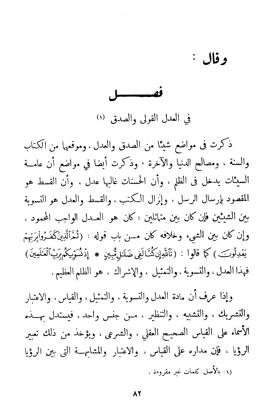 ذَكَرْت فِي مَوَاضِعَ شَيْئًا مِنْ الصِّدْقِ وَالْعَدْلِ وَمَوْقِعَهُمَا مِنْ الْكِتَابِ وَالسُّنَّةِ وَمَصَالِحِ الدُّنْيَا وَالْآخِرَةِ وَذَكَرْت أَيْضًا فِي مَوَاضِعَ أَنَّ عَامَّةَ السَّيِّئَاتِ يَدْخُلُ فِي الظُّلْمِ وَأَنَّ الْحَسَنَاتِ غَالِبُهَا عَدْلٌ وَأَنَّ الْقِسْطَ هُوَ الْمَقْصُودُ بِإِرْسَالِ الرُّسُلِ وَإِنْزَالِ الْكُتُبِ وَالْقِسْطُ وَالْعَدْلُ هُوَ التَّسْوِيَةُ بَيْنَ الشَّيْئَيْنِ فَإِنْ كَانَ بَيْنَ مُتَمَاثِلَيْنِ؛ كَانَ هُوَ الْعَدْلَ الْوَاجِبَ الْمَحْمُودَ وَإِنْ كَانَ بَيْنَ الشَّيْءِ وَخِلَافِهِ كَانَ مِنْ بَابِ قَوْلِهِ: {ثُمَّ الَّذِينَ كَفَرُوا بِرَبِّهِمْ يَعْدِلُونَ} كَمَا قَالُوا: {إنْ كُنَّا لَفِي ضَلَالٍ مُبِينٍ} {إذْ نُسَوِّيكُمْ بِرَبِّ الْعَالَمِينَ} فَهَذَا الْعَدْلُ وَالتَّسْوِيَةُ وَالتَّمْثِيلُ وَالْإِشْرَاكُ هُوَ الظُّلْمُ الْعَظِيمُ. وَإِذَا عُرِفَ أَنَّ مَادَّةَ الْعَدْلِ وَالتَّسْوِيَةِ وَالتَّمْثِيلِ وَالْقِيَاسِ. وَالِاعْتِبَارِ وَالتَّشْرِيكِ وَالتَّشْبِيهِ وَالتَّنْظِيرِ مِنْ جِنْسٍ وَاحِدٍ فَيُسْتَدَلُّ بِهَذِهِ الْأَسْمَاءِ عَلَى الْقِيَاسِ الصَّحِيحِ الْعَقْلِيِّ وَالشَّرْعِيِّ وَيُؤْخَذُ مِنْ ذَلِكَ تَعْبِيرُ الرُّؤْيَا فَإِنَّ مَدَارَهُ عَلَى الْقِيَاسِ وَالِاعْتِبَارِ وَالْمُشَابَهَةِ الَّتِي بَيْنَ الرُّؤْيَا