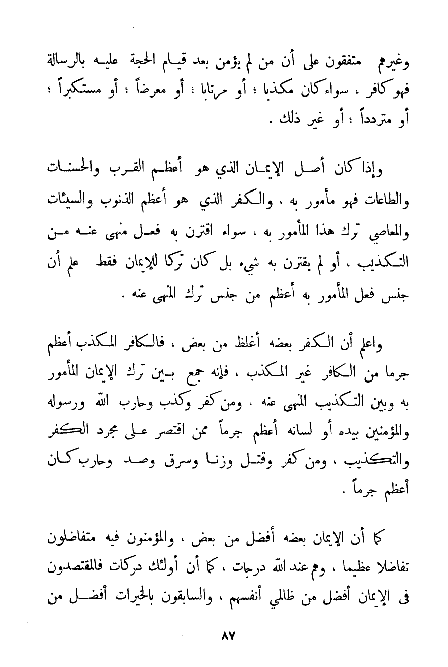 وَغَيْرِهِمْ: مُتَّفِقُونَ عَلَى أَنَّ مَنْ لَمْ يُؤْمِنْ بَعْدَ قِيَامِ الْحُجَّةِ عَلَيْهِ بِالرِّسَالَةِ فَهُوَ كَافِرٌ سَوَاءٌ كَانَ مُكَذِّبًا؛ أَوْ مُرْتَابًا؛ أَوْ مُعْرِضًا؛ أَوْ مُسْتَكْبِرًا؛ أَوْ مُتَرَدِّدًا؛ أَوْ غَيْرَ ذَلِكَ. وَإِذَا كَانَ أَصْلُ الْإِيمَانِ الَّذِي هُوَ أَعْظَمُ الْقِرَبِ وَالْحَسَنَاتِ وَالطَّاعَاتِ فَهُوَ مَأْمُورٌ بِهِ وَالْكُفْرُ الَّذِي هُوَ أَعْظَمُ الذُّنُوبِ وَالسَّيِّئَاتِ وَالْمَعَاصِي تَرْكَ هَذَا الْمَأْمُورِ بِهِ سَوَاءٌ اقْتَرَنَ بِهِ فِعْلٌ مَنْهِيٌّ عَنْهُ مِنْ التَّكْذِيبِ أَوْ لَمْ يَقْتَرِنْ بِهِ شَيْءٌ بَلْ كَانَ تَرْكًا لِلْإِيمَانِ فَقَطْ: عُلِمَ أَنَّ جِنْسَ فِعْلِ الْمَأْمُورِ بِهِ أَعْظَمُ مِنْ جِنْسِ تَرْكِ الْمَنْهِيِّ عَنْهُ.