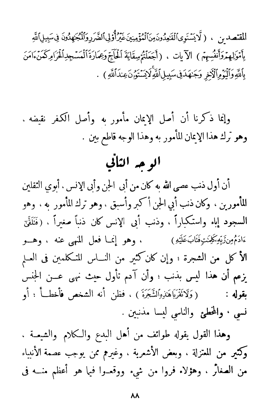 الْمُقْتَصِدِينَ {لَا يَسْتَوِي الْقَاعِدُونَ مِنَ الْمُؤْمِنِينَ غَيْرُ أُولِي الضَّرَرِ وَالْمُجَاهِدُونَ فِي سَبِيلِ اللَّهِ بِأَمْوَالِهِمْ وَأَنْفُسِهِمْ} الْآيَاتِ {أَجَعَلْتُمْ سِقَايَةَ الْحَاجِّ وَعِمَارَةَ الْمَسْجِدِ الْحَرَامِ كَمَنْ آمَنَ بِاللَّهِ وَالْيَوْمِ الْآخِرِ وَجَاهَدَ فِي سَبِيلِ اللَّهِ لَا يَسْتَوُونَ عِنْدَ اللَّهِ} . وَإِنَّمَا ذَكَرْنَا أَنَّ أَصْلَ الْإِيمَانِ مَأْمُورٌ بِهِ وَأَصْلَ الْكُفْرِ نَقِيضُهُ وَهُوَ تَرْكُ هَذَا الْإِيمَانِ الْمَأْمُورِ بِهِ وَهَذَا الْوَجْهُ قَاطِعٌ بَيِّنٌ.