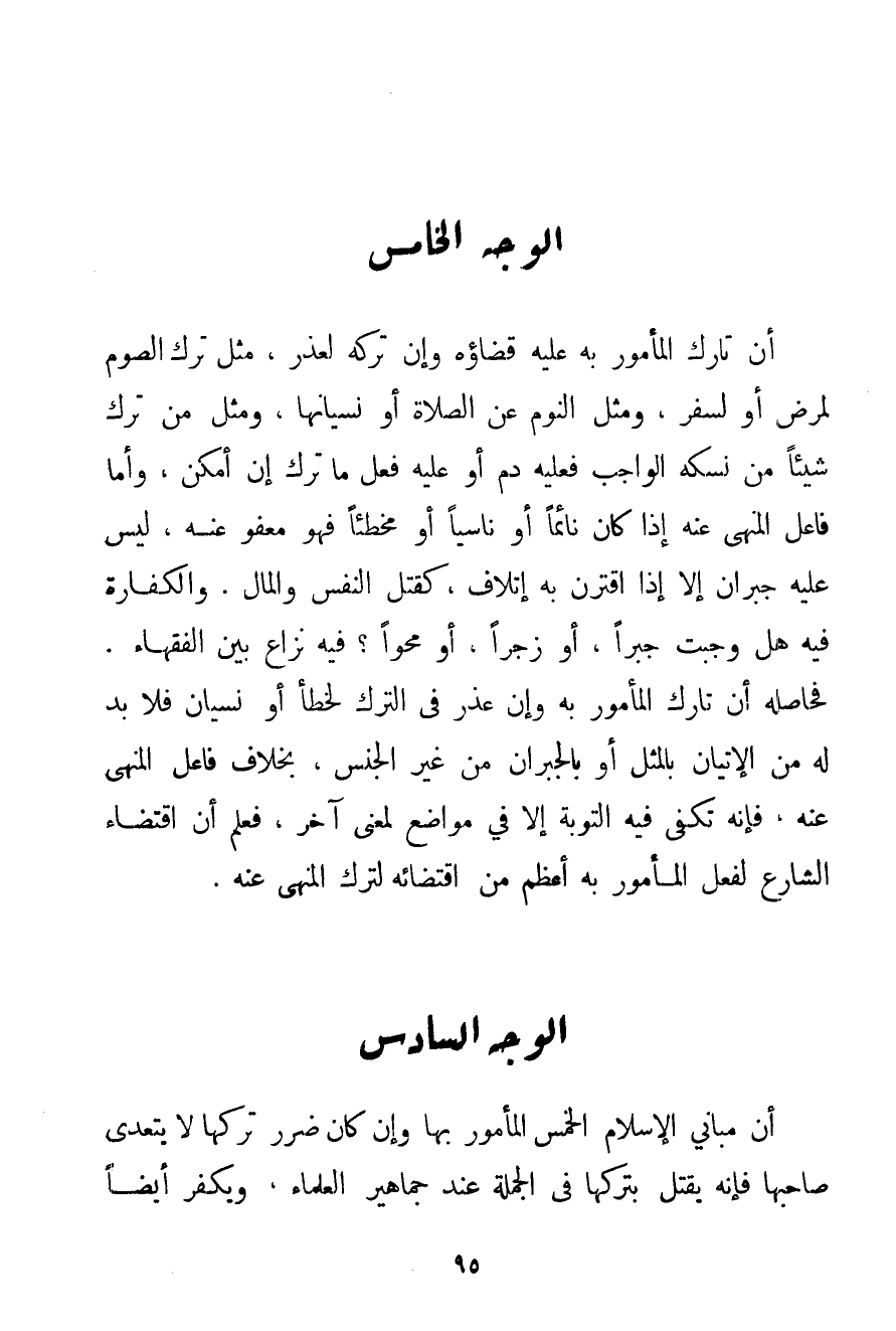 الْوَجْهُ الْخَامِسُ: أَنَّ تَارِكَ الْمَأْمُورِ بِهِ عَلَيْهِ قَضَاؤُهُ وَإِنْ تَرَكَهُ لِعُذْرِ مِثْلَ تَرْكِ الصَّوْمِ لِمَرَضِ أَوْ لِسَفَرٍ وَمِثْلَ النَّوْمِ عَنْ الصَّلَاةِ أَوْ نِسْيَانِهَا وَمِثْلَ مَنْ تَرَكَ شَيْئًا مِنْ نُسُكِهِ الْوَاجِبِ فَعَلَيْهِ دَمٌ أَوْ عَلَيْهِ فِعْلُ مَا تَرَكَ إنْ أَمْكَنَ وَأَمَّا فَاعِلُ الْمَنْهِيِّ عَنْهُ إذَا كَانَ نَائِمًا أَوْ نَاسِيًا أَوْ مُخْطِئًا فَهُوَ مَعْفُوٌّ عَنْهُ لَيْسَ عَلَيْهِ جبران إلَّا إذَا اقْتَرَنَ بِهِ إتْلَافٌ كَقَتْلِ النَّفْسِ وَالْمَالِ. وَالْكَفَّارَةُ فِيهِ هَلْ وَجَبَتْ جَبْرًا أَوْ زَجْرًا أَوْ مَحْوًا؟ فِيهِ نِزَاعٌ بَيْنَ الْفُقَهَاءِ. فَحَاصِلُهُ أَنَّ تَارِكَ الْمَأْمُورِ بِهِ وَإِنْ عُذِرَ فِي التَّرْكِ لِخَطَأِ أَوْ نِسْيَانٍ فَلَا بُدَّ لَهُ مِنْ الْإِتْيَانِ بِالْمِثْلِ أَوْ بِالْجُبْرَانِ مِنْ غَيْرِ الْجِنْسِ بِخِلَافِ فَاعِلِ الْمَنْهِيِّ عَنْهُ فَإِنَّهُ تَكْفِي فِيهِ التَّوْبَةُ إلَّا فِي مَوَاضِعَ لِمَعْنَى آخَرَ فَعُلِمَ أَنَّ اقْتِضَاءَ الشَّارِعِ لِفِعْلِ الْمَأْمُورِ بِهِ أَعْظَمُ مِنْ اقْتِضَائِهِ لِتَرْكِ الْمَنْهِيِّ عَنْهُ.