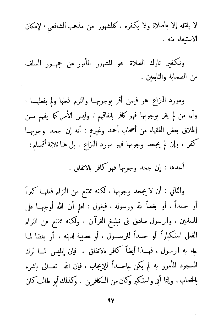 لَا يَقْتُلُهُ إلَّا بِالصَّلَاةِ وَلَا يُكَفِّرُهُ كَالْمَشْهُورِ مِنْ مَذْهَبِ الشَّافِعِيِّ لِإِمْكَانِ الِاسْتِيفَاءِ مِنْهُ. وَتَكْفِيرُ تَارِكِ الصَّلَاةِ هُوَ الْمَشْهُورُ الْمَأْثُورُ عَنْ جُمْهُورِ السَّلَفِ مِنْ الصَّحَابَةِ وَالتَّابِعِينَ. وَمَوْرِدُ النِّزَاعِ هُوَ فِيمَنْ أَقَرَّ بِوُجُوبِهَا وَالْتَزَمَ فِعْلَهَا وَلَمْ يَفْعَلْهَا وَأَمَّا مَنْ لَمْ يُقِرَّ بِوُجُوبِهَا فَهُوَ كَافِرٌ بِاتِّفَاقِهِمْ وَلَيْسَ الْأَمْرُ كَمَا يُفْهَمُ مِنْ إطْلَاقِ بَعْضِ الْفُقَهَاءِ مِنْ أَصْحَابِ أَحْمَد وَغَيْرِهِمْ: أَنَّهُ إنْ جَحَدَ وُجُوبَهَا كَفَرَ وَإِنْ لَمْ يَجْحَدْ وُجُوبَهَا فَهُوَ مَوْرِدُ النِّزَاعِ بَلْ هُنَا ثَلَاثَةُ أَقْسَامٍ: أَحَدُهَا: إنْ جَحَدَ وُجُوبَهَا فَهُوَ كَافِرٌ بِالِاتِّفَاقِ. وَالثَّانِي: أَنْ لَا يَجْحَدَ وُجُوبَهَا لَكِنَّهُ مُمْتَنِعٌ مِنْ الْتِزَامِ فِعْلِهَا كِبْرًا أَوْ حَسَدًا أَوْ بُغْضًا لِلَّهِ وَرَسُولِهِ فَيَقُولُ: اعْلَمْ أَنَّ اللَّهَ أَوْجَبَهَا عَلَى الْمُسْلِمِينَ وَالرَّسُولَ صَادِقٌ فِي تَبْلِيغِ الْقُرْآنِ وَلَكِنَّهُ مُمْتَنِعٌ عَنْ الْتِزَامِ الْفِعْلِ اسْتِكْبَارًا أَوْ حَسَدًا لِلرَّسُولِ أَوْ عَصَبِيَّةً لِدِينِهِ أَوْ بُغْضًا لِمَا جَاءَ بِهِ الرَّسُولُ فَهَذَا أَيْضًا كَافِرٌ بِالِاتِّفَاقِ فَإِنَّ إبْلِيسَ لَمَّا تَرَكَ السُّجُودَ الْمَأْمُورَ بِهِ لَمْ يَكُنْ جَاحِدًا لِلْإِيجَابِ فَإِنَّ اللَّهَ تَعَالَى بَاشَرَهُ بِالْخِطَابِ وَإِنَّمَا أَبَى وَاسْتَكْبَرَ وَكَانَ مِنْ الْكَافِرِينَ. وَكَذَلِكَ أَبُو طَالِبٍ كَانَ