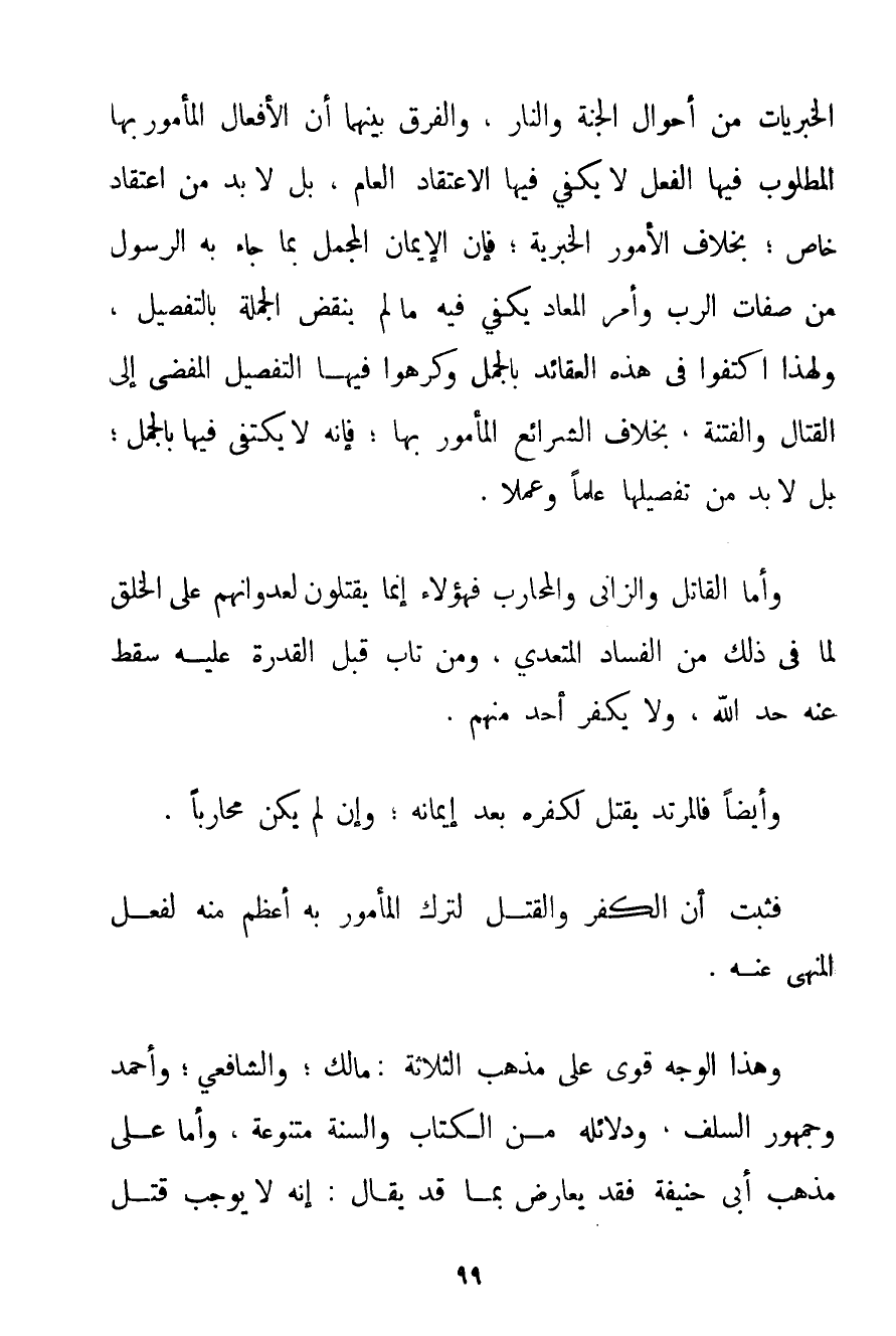 الْخَبَرِيَّاتِ مِنْ أَحْوَالِ الْجَنَّةِ وَالنَّارِ وَالْفَرْقُ بَيْنَهُمَا أَنَّ الْأَفْعَالَ الْمَأْمُورَ بِهَا الْمَطْلُوبُ فِيهَا الْفِعْلُ لَا يَكْفِي فِيهَا الِاعْتِقَادُ الْعَامُّ بَلْ لَا بُدَّ مِنْ اعْتِقَادٍ خَاصٍّ؛ بِخِلَافِ الْأُمُورِ الْخَبَرِيَّةِ؛ فَإِنَّ الْإِيمَانَ الْمُجْمَلَ بِمَا جَاءَ بِهِ الرَّسُولُ مِنْ صِفَاتِ الرَّبِّ وَأَمْرِ الْمُعَادِ يَكْفِي فِيهِ مَا لَمْ يَنْقُضْ الْجُمْلَةَ بِالتَّفْصِيلِ وَلِهَذَا اكْتَفَوْا فِي هَذِهِ الْعَقَائِدِ بِالْجُمَلِ وَكَرِهُوا فِيهَا التَّفْصِيلَ الْمُفْضِيَ إلَى الْقِتَالِ وَالْفِتْنَةِ بِخِلَافِ الشَّرَائِعِ الْمَأْمُورِ بِهَا؛ فَإِنَّهُ لَا يَكْتَفِي فِيهَا بِالْجُمَلِ؛ بَلْ لَا بُدَّ مِنْ تَفْصِيلِهَا عِلْمًا وَعَمَلًا. وَأَمَّا الْقَاتِلُ وَالزَّانِي وَالْمُحَارِبُ فَهَؤُلَاءِ إنَّمَا يُقْتَلُونَ لِعُدْوَانِهِمْ عَلَى الْخَلْقِ لِمَا فِي ذَلِكَ مِنْ الْفَسَادِ الْمُتَعَدِّي وَمَنْ تَابَ قَبْلَ الْقُدْرَةِ عَلَيْهِ سَقَطَ عَنْهُ حَدُّ اللَّهِ وَلَا يَكْفُرُ أَحَدٌ مِنْهُمْ. وَأَيْضًا فَالْمُرْتَدُّ يُقْتَلُ لِكُفْرِهِ بَعْدَ إيمَانِهِ: وَإِنْ لَمْ يَكُنْ مُحَارِبًا. فَثَبَتَ أَنَّ الْكُفْرَ وَالْقَتْلَ لِتَرْكِ الْمَأْمُورِ بِهِ أَعْظَمُ مِنْهُ لِفِعْلِ الْمَنْهِيِّ عَنْهُ. وَهَذَا الْوَجْهُ قَوِيٌّ عَلَى مَذْهَبِ الثَّلَاثَةِ: مَالِكٍ؛ وَالشَّافِعِيِّ؛ وَأَحْمَد وَجُمْهُورِ السَّلَفِ وَدَلَائِلُهُ مِنْ الْكِتَابِ وَالسُّنَّةِ مُتَنَوِّعَةٌ وَأَمَّا عَلَى مَذْهَبِ أَبِي حَنِيفَةَ فَقَدْ يُعَارَضُ بِمَا قَدْ يُقَالُ: إنَّهُ لَا يُوجِبُ قَتْلَ