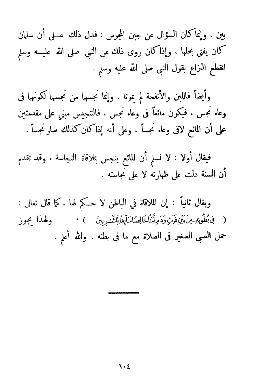 بَيِّنٌ وَإِنَّمَا كَانَ السُّؤَالُ عَنْ جُبْنِ الْمَجُوسِ: فَدَلَّ ذَلِكَ عَلَى أَنَّ سَلْمَانَ كَانَ يُفْتِي بِحِلِّهَا وَإِذَا كَانَ رُوِيَ ذَلِكَ عَنْ النَّبِيِّ صَلَّى اللَّهُ عَلَيْهِ وَسَلَّمَ انْقَطَعَ النِّزَاعُ بِقَوْلِ النَّبِيِّ صَلَّى اللَّهُ عَلَيْهِ وَسَلَّمَ. وَأَيْضًا فَاللَّبَنُ وَالْإِنْفَحَةُ لَمْ يَمُوتَا وَإِنَّمَا نَجَّسَهُمَا مَنْ نَجَّسَهُمَا لِكَوْنِهِمَا فِي وِعَاءٍ نَجِسٍ فَيَكُونُ مَائِعًا فِي وِعَاءٍ نَجِسٍ فَالتَّنْجِيسُ مَبْنِيٌّ عَلَى مُقَدِّمَتَيْنِ عَلَى أَنَّ الْمَائِعَ لَاقَى وِعَاءً نَجِسًا وَعَلَى أَنَّهُ إذَا كَانَ كَذَلِكَ صَارَ نَجِسًا. فَيُقَالُ أَوَّلًا: لَا نُسَلِّمُ أَنَّ الْمَائِعَ يَنْجُسُ بِمُلَاقَاةِ النَّجَاسَةِ وَقَدْ تَقَدَّمَ أَنَّ السُّنَّةَ دَلَّتْ عَلَى طَهَارَتِهِ لَا عَلَى نَجَاسَتِهِ. وَيُقَالُ ثَانِيًا: إنَّ الْمُلَاقَاةَ فِي الْبَاطِنِ لَا حُكْمَ لَهَا كَمَا قَالَ تَعَالَى: {نُسْقِيكُمْ مِمَّا فِي بُطُونِهِ مِنْ بَيْنِ فَرْثٍ وَدَمٍ لَبَنًا خَالِصًا سَائِغًا لِلشَّارِبِينَ} وَلِهَذَا يَجُوزُ حَمْلُ الصَّبِيِّ الصَّغِيرِ فِي الصَّلَاةِ مَعَ مَا فِي بَطْنِهِ. وَاَللَّهُ أَعْلَمُ.
