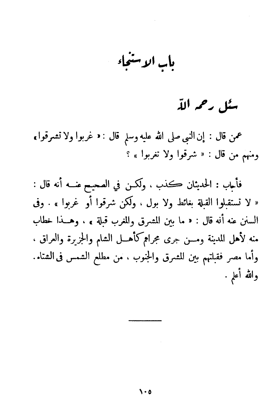 سُئِلَ رَحِمَهُ اللَّهُ عَمَّنْ قَالَ: إنَّ النَّبِيَّ صَلَّى اللَّهُ عَلَيْهِ وَسَلَّمَ قَالَ: {غَرِّبُوا وَلَا تُشَرِّقُوا} وَمِنْهُمْ مَنْ قَالَ: {شَرِّقُوا وَلَا تُغَرِّبُوا} ؟ .