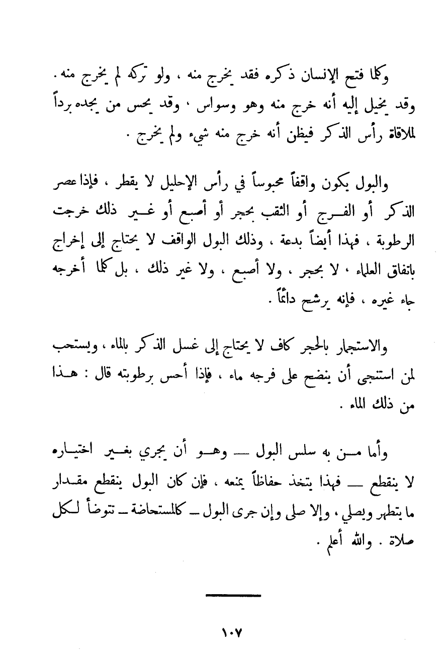 وَكُلَّمَا فَتَحَ الْإِنْسَانُ ذَكَرَهُ فَقَدْ يَخْرُجُ مِنْهُ وَلَوْ تَرَكَهُ لَمْ يَخْرُجْ مِنْهُ. وَقَدْ يُخَيَّلُ إلَيْهِ أَنَّهُ خَرَجَ مِنْهُ وَهُوَ وَسْوَاسٌ وَقَدْ يُحِسُّ مَنْ يَجِدُهُ بَرْدًا لِمُلَاقَاةِ رَأْسِ الذَّكَرِ فَيَظُنُّ أَنَّهُ خَرَجَ مِنْهُ شَيْءٌ وَلَمْ يَخْرُجْ. وَالْبَوْلُ يَكُونُ وَاقِفًا مَحْبُوسًا فِي رَأْسِ الْإِحْلِيلِ لَا يَقْطُرُ فَإِذَا عَصَرَ الذَّكَرَ أَوْ الْفَرْجَ أَوْ الثُّقْبَ بِحَجَرِ أَوْ أُصْبُعٍ أَوْ غَيْرِ ذَلِكَ خَرَجَتْ الرُّطُوبَةُ فَهَذَا أَيْضًا بِدْعَةٌ وَذَلِكَ الْبَوْلُ الْوَاقِفُ لَا يَحْتَاجُ إلَى إخْرَاجٍ بِاتِّفَاقِ الْعُلَمَاءِ لَا بِحَجَرِ وَلَا أُصْبُعٍ وَلَا غَيْرِ ذَلِكَ بَلْ كُلَّمَا أَخْرَجَهُ جَاءَ غَيْرُهُ فَإِنَّهُ يَرْشَحُ دَائِمًا. وَالِاسْتِجْمَارُ بِالْحَجَرِ كَافٍ لَا يَحْتَاجُ إلَى غَسْلِ الذَّكَرِ بِالْمَاءِ وَيُسْتَحَبُّ لِمَنْ اسْتَنْجَى أَنْ يَنْضَحَ عَلَى فَرْجِهِ مَاءً فَإِذَا أَحَسَّ بِرُطُوبَتِهِ قَالَ: هَذَا مِنْ ذَلِكَ الْمَاءِ. وَأَمَّا مَنْ بِهِ سَلَسُ الْبَوْلِ - وَهُوَ أَنْ يَجْرِيَ بِغَيْرِ اخْتِيَارِهِ لَا يَنْقَطِعُ - فَهَذَا يَتَّخِذُ حِفَاظًا يَمْنَعُهُ فَإِنْ كَانَ الْبَوْلُ يَنْقَطِعُ مِقْدَارَ مَا يَتَطَهَّرُ وَيُصَلِّي وَإِلَّا صَلَّى وَإِنْ جَرَى الْبَوْلُ - كَالْمُسْتَحَاضَةِ - تَتَوَضَّأُ لِكُلِّ صَلَاةٍ. وَاَللَّهُ أَعْلَمُ.