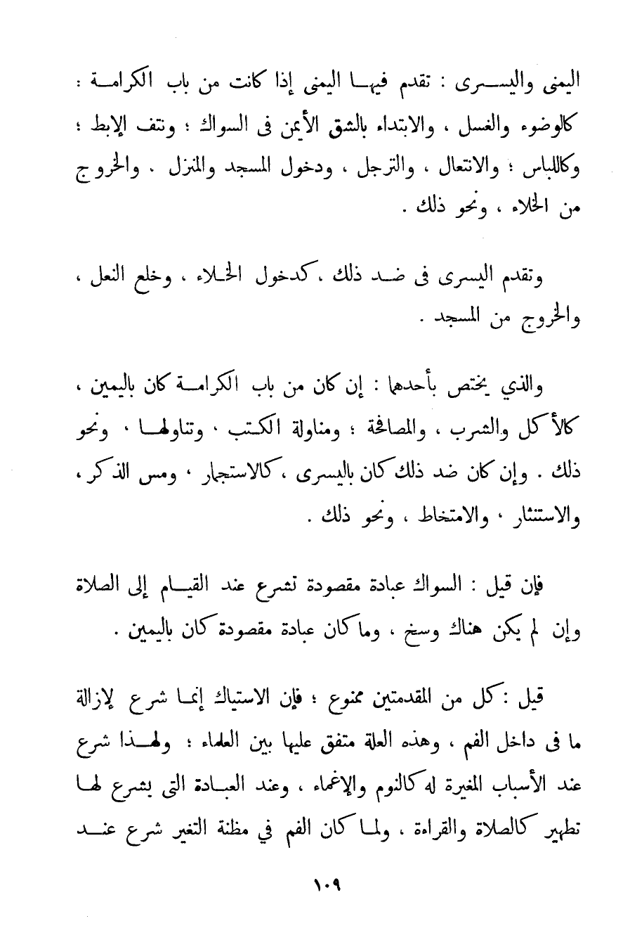 الْيُمْنَى وَالْيُسْرَى: تُقَدَّمُ فِيهَا الْيُمْنَى إذَا كَانَتْ مِنْ بَابِ الْكَرَامَةِ؛ كَالْوُضُوءِ وَالْغُسْلِ وَالِابْتِدَاءِ بِالشِّقِّ الْأَيْمَنِ فِي السِّوَاكِ؛ وَنَتْفِ الْإِبِطِ؛ وَكَاللِّبَاسِ؛ وَالِانْتِعَالِ وَالتَّرَجُّلِ وَدُخُولِ الْمَسْجِدِ وَالْمَنْزِلِ وَالْخُرُوجِ مِنْ الْخَلَاءِ وَنَحْوِ ذَلِكَ. وَتُقَدَّمُ الْيُسْرَى فِي ضِدِّ ذَلِكَ كَدُخُولِ الْخَلَاءِ وَخَلْعِ النَّعْلِ وَالْخُرُوجِ مِنْ الْمَسْجِدِ وَاَلَّذِي يَخْتَصُّ بِأَحَدِهِمَا: إنْ كَانَ مِنْ بَابِ الْكَرَامَةِ كَانَ بِالْيَمِينِ كَالْأَكْلِ وَالشُّرْبِ وَالْمُصَافَحَةِ؛ وَمُنَاوَلَةِ الْكُتُبِ وَتَنَاوُلِهَا وَنَحْوِ ذَلِكَ. وَإِنْ كَانَ ضِدَّ ذَلِكَ كَانَ بِالْيُسْرَى كَالِاسْتِجْمَارِ وَمَسِّ الذَّكَرِ وَالِاسْتِنْثَارِ وَالِامْتِخَاطِ وَنَحْوِ ذَلِكَ. فَإِنْ قِيلَ: السِّوَاكُ عِبَادَةٌ مَقْصُودَةٌ تُشْرَعُ عِنْدَ الْقِيَامِ إلَى الصَّلَاةِ وَإِنْ لَمْ يَكُنْ هُنَاكَ وَسَخٌ وَمَا كَانَ عِبَادَةً مَقْصُودَةً كَانَ بِالْيَمِينِ. قِيلَ: كُلٌّ مِنْ الْمُقَدِّمَتَيْنِ مَمْنُوعٌ؛ فَإِنَّ الِاسْتِيَاكَ إنَّمَا شُرِعَ لِإِزَالَةِ مَا فِي دَاخِلِ الْفَمِ وَهَذِهِ الْعِلَّةُ مُتَّفَقٌ عَلَيْهَا بَيْنَ الْعُلَمَاءِ؛ وَلِهَذَا شُرِعَ عِنْدَ الْأَسْبَابِ الْمُغَيِّرَةِ لَهُ كَالنَّوْمِ وَالْإِغْمَاءِ وَعِنْدَ الْعِبَادَةِ الَّتِي يُشْرَعُ لَهَا تَطْهِيرٌ كَالصَّلَاةِ وَالْقِرَاءَةِ وَلَمَّا كَانَ الْفَمُ فِي مَظِنَّةِ التَّغَيُّرِ شُرِعَ عِنْدَ