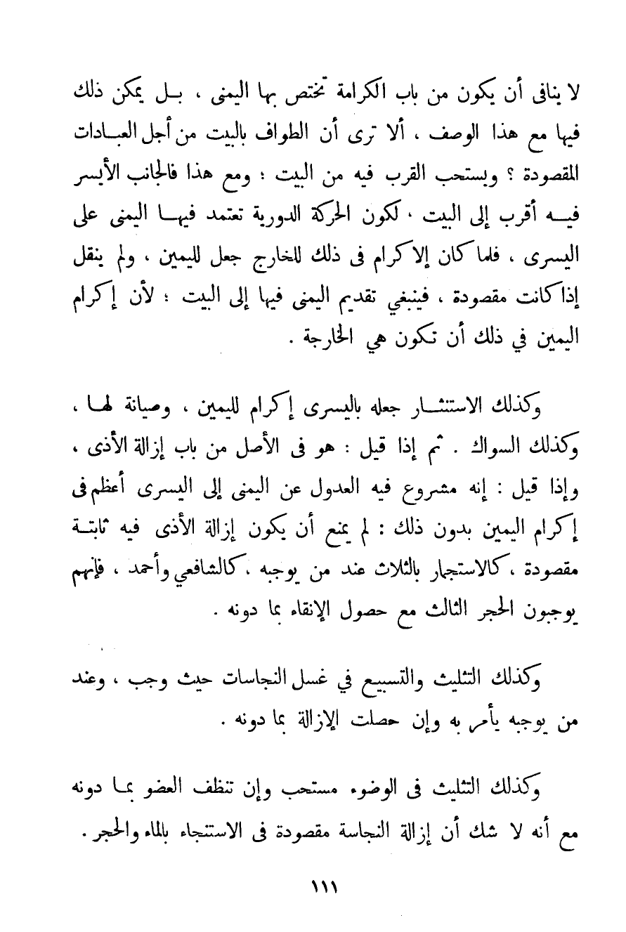 لَا يُنَافِي أَنْ يَكُونَ مِنْ بَابِ الْكَرَامَةِ تَخْتَصُّ بِهَا الْيُمْنَى بَلْ يُمْكِنُ ذَلِكَ فِيهَا مَعَ هَذَا الْوَصْفِ أَلَا تَرَى أَنَّ الطَّوَافَ بِالْبَيْتِ مِنْ أَجْلِ الْعِبَادَاتِ الْمَقْصُودَةِ؟ وَيُسْتَحَبُّ الْقُرْبُ فِيهِ مِنْ الْبَيْتِ؛ وَمَعَ هَذَا فَالْجَانِبُ الْأَيْسَرُ فِيهِ أَقْرَبُ إلَى الْبَيْتِ لِكَوْنِ الْحَرَكَةِ الدَّوْرِيَّةِ تَعْتَمِدُ فِيهَا الْيُمْنَى عَلَى الْيُسْرَى فَلَمَّا كَانَ الْإِكْرَامُ فِي ذَلِكَ لِلْخَارِجِ جُعِلَ لِلْيَمِينِ وَلَمْ يُنْقَلْ إذَا كَانَتْ مَقْصُودَةً فَيَنْبَغِي تَقْدِيمُ الْيُمْنَى فِيهَا إلَى الْبَيْتِ؛ لِأَنَّ إكْرَامَ الْيَمِينِ فِي ذَلِكَ أَنْ تَكُونَ هِيَ الْخَارِجَةَ. وَكَذَلِكَ الِاسْتِنْثَارُ جَعْلُهُ بِالْيُسْرَى إكْرَامٌ لِلْيَمِينِ وَصِيَانَةٌ لَهَا وَكَذَلِكَ السِّوَاكُ. ثُمَّ إذَا قِيلَ: هُوَ فِي الْأَصْلِ مِنْ بَابِ إزَالَةِ الْأَذَى وَإِذَا قِيلَ: إنَّهُ مَشْرُوعٌ فِيهِ الْعُدُولُ عَنْ الْيُمْنَى إلَى الْيُسْرَى أَعْظَمُ فِي إكْرَامِ الْيَمِينِ بِدُونِ ذَلِكَ: لَمْ يُمْنَعْ أَنْ يَكُونَ إزَالَةُ الْأَذَى فِيهِ ثَابِتَةً مَقْصُودَةً كَالِاسْتِجْمَارِ بِالثَّلَاثِ عِنْدَ مَنْ يُوجِبُهُ كَالشَّافِعِيِّ وَأَحْمَد فَإِنَّهُمْ يُوجِبُونَ الْحَجَرَ الثَّالِثَ مَعَ حُصُولِ الْإِنْقَاءِ بِمَا دُونَهُ. وَكَذَلِكَ التَّثْلِيثُ وَالتَّسْبِيعُ فِي غَسْلِ النَّجَاسَاتِ حَيْثُ وَجَبَ وَعِنْدَ مَنْ يُوجِبُهُ يَأْمُرُ بِهِ وَإِنْ حَصَلَتْ الْإِزَالَةُ بِمَا دُونَهُ. وَكَذَلِكَ التَّثْلِيثُ فِي الْوُضُوءِ مُسْتَحَبٌّ وَإِنْ تَنَظَّفَ الْعُضْوُ بِمَا دُونَهُ مَعَ أَنَّهُ لَا شَكَّ أَنَّ إزَالَةَ النَّجَاسَةِ مَقْصُودَةٌ فِي الِاسْتِنْجَاءِ بِالْمَاءِ وَالْحَجَرِ.