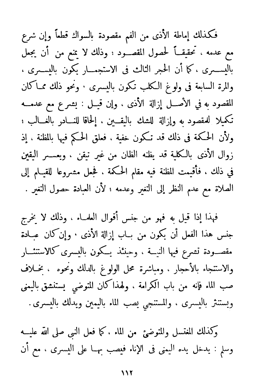 فَكَذَلِكَ إمَاطَةُ الْأَذَى مِنْ الْفَمِ مَقْصُودَةٌ بِالسِّوَاكِ قَطْعًا وَإِنْ شُرِعَ مَعَ عَدَمِهِ تَحْقِيقًا لِحُصُولِ الْمَقْصُودِ؛ وَذَلِكَ لَا يَمْنَعُ مِنْ أَنْ يُجْعَلَ بِالْيُسْرَى كَمَا أَنَّ الْحَجَرَ الثَّالِثَ فِي الِاسْتِجْمَارِ يَكُونُ بِالْيُسْرَى وَالْمَرَّةَ السَّابِعَةَ فِي وُلُوغِ الْكَلْبِ تَكُونُ بِالْيُسْرَى وَنَحْوَ ذَلِكَ مِمَّا كَانَ الْمَقْصُودُ بِهِ فِي الْأَصْلِ إزَالَةَ الْأَذَى وَإِنْ قِيلَ: يُشْرَعُ مَعَ عَدَمِهِ تَكْمِيلًا لِلْمَقْصُودِ بِهِ وَإِزَالَةً لِلشَّكِّ بِالْيَقِينِ إلْحَاقًا لِلنَّادِرِ بِالْغَالِبِ؛ وَلِأَنَّ الْحِكْمَةَ فِي ذَلِكَ قَدْ تَكُونُ خَفِيَّةً فَعُلِّقَ الْحُكْمُ فِيهَا بِالْمَظِنَّةِ إذْ زَوَالُ الْأَذَى بِالْكُلِّيَّةِ قَدْ يَظُنُّهُ الظَّانُّ مِنْ غَيْرِ تَيَقُّنٍ وَيَعْسُرُ الْيَقِينُ فِي ذَلِكَ فَأُقِيمَتْ الْمَظِنَّةُ فِيهِ مَقَامَ الْحِكْمَةِ فَجُعِلَ مَشْرُوعًا لِلْقِيَامِ إلَى الصَّلَاةِ مَعَ عَدَمِ النَّظَرِ إلَى التَّغَيُّرِ وَعَدَمِهِ؛ لِأَنَّ الْعِبَادَةَ حُصُولُ التَّغَيُّرِ. فَهَذَا إذَا قِيلَ بِهِ فَهُوَ مِنْ جِنْسِ أَقْوَالِ الْعُلَمَاءِ وَذَلِكَ لَا يُخْرِجُ جِنْسَ هَذَا الْفِعْلِ أَنْ يَكُونَ مِنْ بَابِ إزَالَةِ الْأَذَى وَإِنْ كَانَ عِبَادَةً مَقْصُودَةً تُشْرَعُ فِيهَا النِّيَّةُ وَحِينَئِذٍ يَكُونُ بِالْيُسْرَى كَالِاسْتِنْثَارِ وَالِاسْتِنْجَاءِ بِالْأَحْجَارِ وَمُبَاشَرَةِ مَحَلِّ الْوُلُوغِ بِالدَّلْكِ وَنَحْوِهِ بِخِلَافِ صَبِّ الْمَاءِ فَإِنَّهُ مِنْ بَابِ الْكَرَامَةِ وَلِهَذَا كَانَ الْمُتَوَضِّئُ يَسْتَنْشِقُ بِالْيُمْنَى وَيَسْتَنْثِرُ بِالْيُسْرَى وَالْمُسْتَنْجِي يَصُبُّ الْمَاءَ بِالْيَمِينِ وَيُدَلِّكُ بِالْيُسْرَى. وَكَذَلِكَ الْمُغْتَسِلُ وَالْمُتَوَضِّئُ مِنْ الْمَاءِ كَمَا فَعَلَ النَّبِيُّ صَلَّى اللَّهُ عَلَيْهِ وَسَلَّمَ يُدْخِلُ يَدَهُ الْيُمْنَى فِي الْإِنَاءِ فَيَصُبُّ بِهَا عَلَى الْيُسْرَى مَعَ أَنَّ
