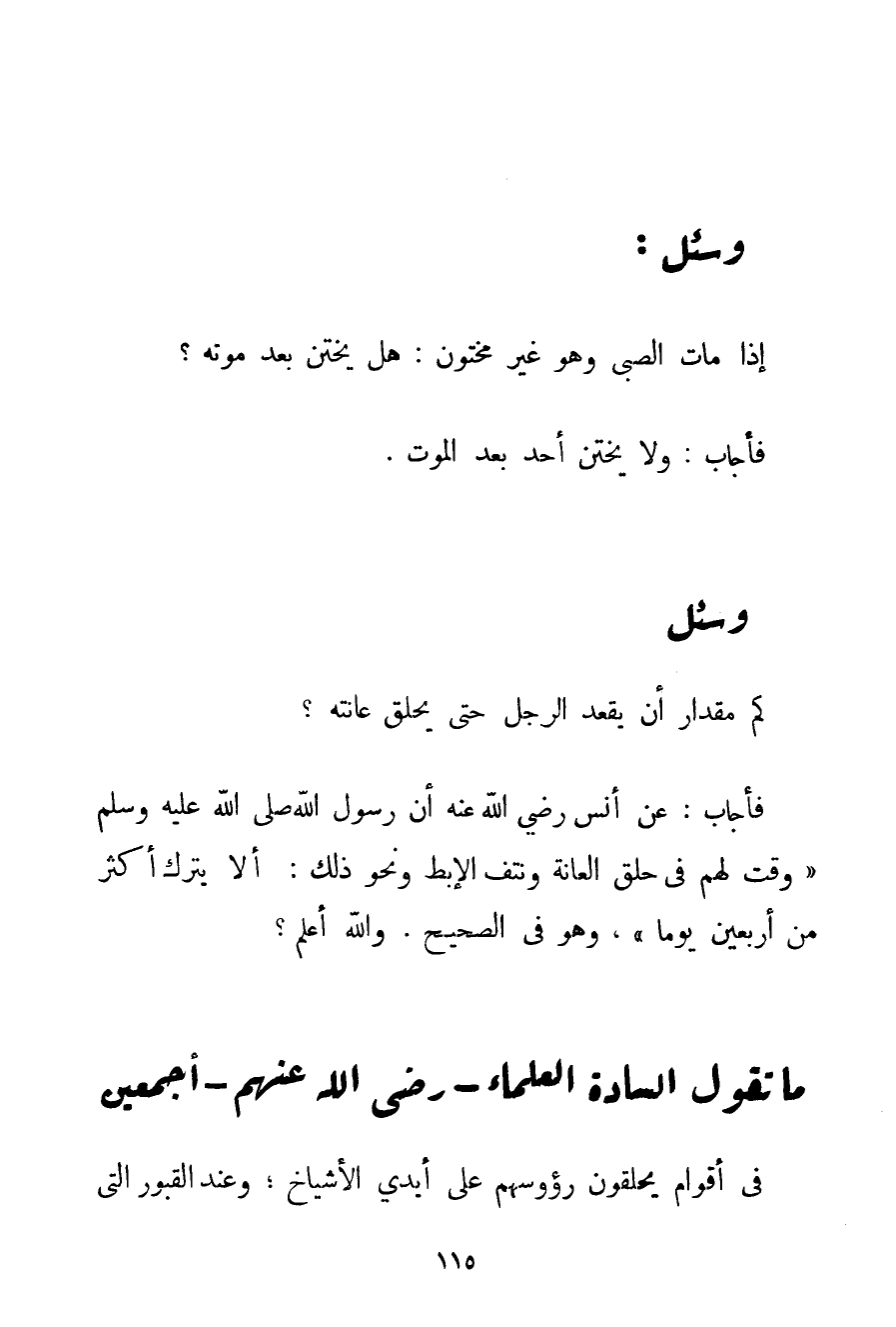 فَأَجَابَ: عَنْ أَنَسٍ رَضِيَ اللَّهُ عَنْهُ {أَنَّ رَسُولَ اللَّهِ صَلَّى اللَّهُ عَلَيْهِ وَسَلَّمَ وَقَّتَ لَهُمْ فِي حَلْقِ الْعَانَةِ وَنَتْفِ الْإِبِطِ وَنَحْوِ ذَلِكَ: أَلَّا يَتْرُكَ أَكْثَرَ مِنْ أَرْبَعِينَ يَوْمًا} وَهُوَ فِي الصَّحِيحِ. وَاَللَّهُ أَعْلَمُ؟ .