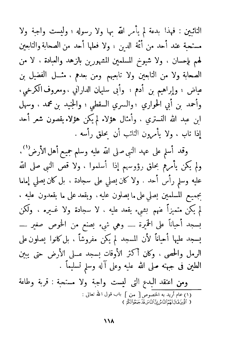التَّائِبِينَ: فَهَذَا بِدْعَةٌ لَمْ يَأْمُرْ اللَّهُ بِهَا وَلَا رَسُولُهُ؛ وَلَيْسَتْ وَاجِبَةً وَلَا مُسْتَحَبَّةً عِنْدَ أَحَدٍ مِنْ أَئِمَّةِ الدِّينِ؛ وَلَا فَعَلَهَا أَحَدٌ مِنْ الصَّحَابَةِ وَالتَّابِعِينَ لَهُمْ بِإِحْسَانِ وَلَا شُيُوخِ الْمُسْلِمِينَ الْمَشْهُورِينَ بِالزُّهْدِ وَالْعِبَادَةِ لَا مِنْ الصَّحَابَةِ وَلَا مِنْ التَّابِعِينَ وَلَا تَابِعِيهِمْ وَمَنْ بَعْدَهُمْ مِثْلُ الْفُضَيْل بْنِ عِيَاضٍ؛ وَإِبْرَاهِيمَ بْنِ أَدْهَمَ؛ وَأَبِي سُلَيْمَانَ الداراني وَمَعْرُوفٍ الْكَرْخِي وَأَحْمَد بْنِ أَبِي الْحِوَارِيِّ؛ وَالسَّرِيِّ السقطي؛ والْجُنَيْد بْنِ مُحَمَّدٍ وَسَهْلِ بْنِ عَبْدِ اللَّهِ التستري وَأَمْثَالِ هَؤُلَاءِ لَمْ يَكُنْ هَؤُلَاءِ يَقُصُّونَ شَعْرَ أَحَدٍ إذَا تَابَ وَلَا يَأْمُرُونَ التَّائِبَ أَنْ يَحْلِقَ رَأْسَهُ. وَقَدْ أَسْلَمَ عَلَى عَهْدِ النَّبِيِّ صَلَّى اللَّهُ عَلَيْهِ وَسَلَّمَ جَمِيعُ أَهْلِ الْأَرْضِ وَلَمْ يَكُنْ يَأْمُرُهُمْ بِحَلْقِ رُءُوسِهِمْ إذَا أَسْلَمُوا وَلَا قَصَّ النَّبِيُّ صَلَّى اللَّهُ عَلَيْهِ وَسَلَّمَ رَأْسَ أَحَدٍ. وَلَا كَانَ يُصَلِّي عَلَى سَجَّادَةٍ بَلْ كَانَ يُصَلِّي إمَامًا بِجَمِيعِ الْمُسْلِمِينَ يُصَلِّي عَلَى مَا يُصَلُّونَ عَلَيْهِ وَيَقْعُدُ عَلَى مَا يَقْعُدُونَ عَلَيْهِ لَمْ يَكُنْ مُتَمَيِّزًا عَنْهُمْ بِشَيْءِ يَقْعُدُ عَلَيْهِ لَا سَجَّادَةٍ وَلَا غَيْرِهِ وَلَكِنْ يَسْجُدُ أَحْيَانًا عَلَى الْخَمِيرَةِ - وَهِيَ شَيْءٌ يُصْنَعُ مِنْ الْخُوصِ صَغِيرٌ - يَسْجُدُ عَلَيْهَا أَحْيَانًا لِأَنَّ الْمَسْجِدَ لَمْ يَكُنْ مَفْرُوشًا بَلْ كَانُوا يُصَلُّونَ عَلَى الرَّمْلِ وَالْحَصَى وَكَانَ أَكْثَرَ الْأَوْقَاتِ يَسْجُدُ عَلَى الْأَرْضِ حَتَّى يَبِينَ الطِّينُ فِي جَبْهَتِهِ صَلَّى اللَّهُ عَلَيْهِ وَعَلَى آلِهِ وَسَلَّمَ تَسْلِيمًا. وَمَنْ اعْتَقَدَ الْبِدَعَ الَّتِي لَيْسَتْ وَاجِبَةً وَلَا مُسْتَحَبَّةً: قُرْبَةً وَطَاعَةً