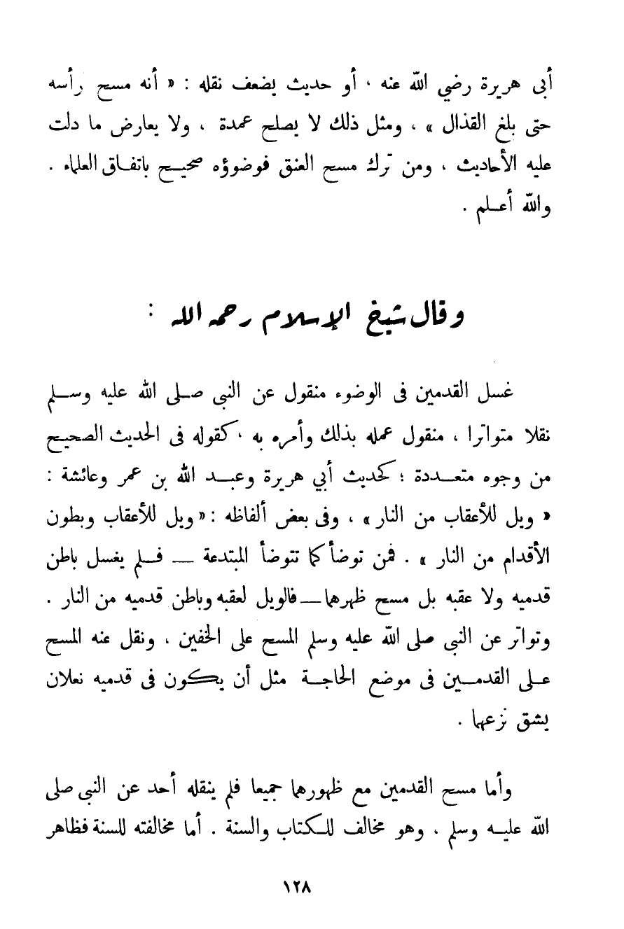 غَسْلُ الْقَدَمَيْنِ فِي الْوُضُوءِ مَنْقُولٌ عَنْ النَّبِيِّ صَلَّى اللَّهُ عَلَيْهِ وَسَلَّمَ نَقْلًا مُتَوَاتِرًا مَنْقُولٌ عَمَلُهُ بِذَلِكَ وَأَمْرُهُ بِهِ كَقَوْلِهِ فِي الْحَدِيثِ الصَّحِيحِ مِنْ وُجُوهٍ مُتَعَدِّدَةٍ؛ كَحَدِيثِ أَبِي هُرَيْرَةَ وَعَبْدِ اللَّهِ بْنِ عُمَرَ وَعَائِشَةَ: {وَيْلٌ لِلْأَعْقَابِ مِنْ النَّارِ} وَفِي بَعْضِ أَلْفَاظِهِ: {وَيْلٌ لِلْأَعْقَابِ وَبُطُونِ الْأَقْدَامِ مِنْ النَّارِ} . فَمَنْ تَوَضَّأَ كَمَا تَتَوَضَّأُ الْمُبْتَدِعَةُ - فَلَمْ يَغْسِلْ بَاطِنَ قَدَمَيْهِ وَلَا عَقِبَهُ بَلْ مَسَحَ ظَهْرَهُمَا - فَالْوَيْلُ لِعَقِبِهِ وَبَاطِنِ قَدَمَيْهِ مِنْ النَّارِ. وَتَوَاتَرَ عَنْ النَّبِيِّ صَلَّى اللَّهُ عَلَيْهِ وَسَلَّمَ الْمَسْحُ عَلَى الْخُفَّيْنِ وَنُقِلَ عَنْهُ الْمَسْحُ عَلَى الْقَدَمَيْنِ فِي مَوْضِعِ الْحَاجَةِ مِثْلَ أَنْ يَكُونَ فِي قَدَمَيْهِ نَعْلَانِ يَشُقُّ نَزْعُهُمَا. وَأَمَّا مَسْحُ الْقَدَمَيْنِ مَعَ ظُهُورِهِمَا جَمِيعًا فَلَمْ يَنْقُلْهُ أَحَدٌ عَنْ النَّبِيِّ صَلَّى اللَّهُ عَلَيْهِ وَسَلَّمَ وَهُوَ مُخَالِفٌ لِلْكِتَابِ وَالسُّنَّةِ. أَمَّا مُخَالَفَتُهُ لِلسُّنَّةِ فَظَاهِرٌ