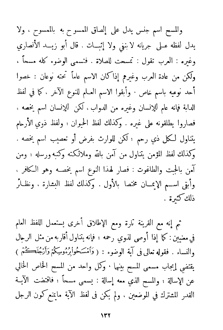وَالْمَسْحُ اسْمُ جِنْسٍ يَدُلُّ عَلَى إلْصَاقِ الْمَمْسُوحِ بِهِ بِالْمَمْسُوحِ وَلَا يَدُلُّ لَفْظُهُ عَلَى جَرَيَانِهِ لَا بِنَفْيٍ وَلَا إثْبَاتٍ. قَالَ أَبُو زَيْدٍ الْأَنْصَارِيُّ وَغَيْرُهُ: الْعَرَبُ تَقُولُ: تَمَسَّحْت لِلصَّلَاةِ. فَتُسَمِّي الْوُضُوءَ كُلَّهُ مَسْحًا وَلَكِنْ مِنْ عَادَةِ الْعَرَبِ وَغَيْرِهِمْ إذَا كَانَ الِاسْمُ عَامًّا تَحْتَهُ نَوْعَانِ: خَصُّوا أَحَدَ نَوْعَيْهِ بِاسْمِ خَاصٍّ. وَأَبْقَوْا الِاسْمَ الْعَامَّ لِلنَّوْعِ الْآخَرِ كَمَا فِي لَفْظِ الدَّابَّةِ فَإِنَّهُ عَامٌ لِلْإِنْسَانِ وَغَيْرِهِ مِنْ الدَّوَابِّ لَكِنْ لِلْإِنْسَانِ اسْم يَخُصُّهُ فَصَارُوا يُطْلِقُونَهُ عَلَى غَيْرِهِ. وَكَذَلِكَ لَفْظُ الْحَيَوَانِ؛ وَلَفْظُ ذَوِي الْأَرْحَامِ يَتَنَاوَلُ لِكُلِّ ذِي رَحِمٍ؛ لَكِنْ لِلْوَارِثِ بِفَرْضِ أَوْ تَعْصِيبٍ اسْمٌ يَخُصُّهُ. وَكَذَلِكَ لَفْظُ الْمُؤْمِنِ يَتَنَاوَلُ مَنْ آمَنَ بِاَللَّهِ وَمَلَائِكَتِهِ وَكُتُبِهِ وَرُسُلِهِ؛ وَمَنْ آمَنَ بِالْجِبْتِ وَالطَّاغُوتِ: فَصَارَ لِهَذَا النَّوْعِ اسْمٌ يَخُصُّهُ وَهُوَ الْكَافِرُ وَأُبْقِيَ اسْمُ الْإِيمَانِ مُخْتَصًّا بِالْأَوَّلِ. وَكَذَلِكَ لَفْظُ الْبِشَارَةِ وَنَظَائِرُ ذَلِكَ كَثِيرَةٌ. ثُمَّ إنَّهُ مَعَ الْقَرِينَةِ تَارَةً وَمَعَ الْإِطْلَاقِ أُخْرَى يُسْتَعْمَلُ اللَّفْظُ الْعَامُّ فِي مَعْنَيَيْنِ: كَمَا إذَا أَوْصَى لِذَوِي رَحِمِهِ؛ فَإِنَّهُ يَتَنَاوَلُ أَقَارِبَهُ مِنْ مِثْلِ الرِّجَالِ وَالنِّسَاءِ. فَقَوْلُهُ تَعَالَى فِي آيَةِ الْوُضُوءِ: وَامْسَحُوا بِرُءُوسِكُمْ وَأَرْجُلِكُمْ يَقْتَضِي إيجَابَ مُسَمَّى الْمَسْحِ بَيْنَهُمَا وَكُلُّ وَاحِدٍ مِنْ الْمَسْحِ الْخَاصِّ الْخَالِي عَنْ الْإِسَالَةِ؛ وَالْمَسْحِ الَّذِي مَعَهُ إسَالَةٌ: يُسَمَّى مَسْحًا؛ فَاقْتَضَتْ الْآيَةُ الْقَدْرَ الْمُشْتَرَكَ فِي الْمَوْضِعَيْنِ وَلَمْ يَكُنْ فِي لَفْظِ الْآيَةِ مَا يَمْنَعُ كَوْنَ الرِّجْلِ