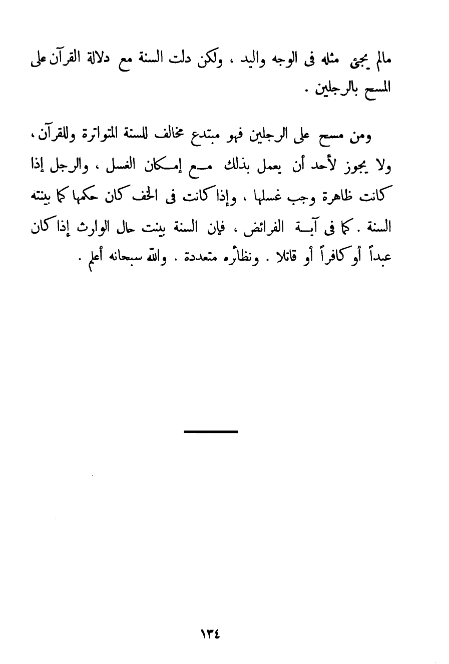 مَا لَمْ يَجِئْ مِثْلُهُ فِي الْوَجْهِ وَالْيَدِ وَلَكِنْ دَلَّتْ السُّنَّةُ مَعَ دِلَالَةِ الْقُرْآنِ عَلَى الْمَسْحِ بِالرِّجْلَيْنِ. وَمَنْ مَسَحَ عَلَى الرِّجْلَيْنِ فَهُوَ مُبْتَدِعٌ مُخَالِفٌ لِلسُّنَّةِ الْمُتَوَاتِرَةِ وَلِلْقُرْآنِ وَلَا يَجُوزُ لِأَحَدِ أَنْ يَعْمَلَ بِذَلِكَ مَعَ إمْكَانِ الْغَسْلِ وَالرِّجْلُ إذَا كَانَتْ ظَاهِرَةً وَجَبَ غَسْلُهَا وَإِذَا كَانَتْ فِي الْخُفِّ كَانَ حُكْمُهَا كَمَا بَيَّنَتْهُ السُّنَّةُ. كَمَا فِي آيَةِ الْفَرَائِضِ فَإِنَّ السُّنَّةَ بَيَّنَتْ حَالَ الْوَارِثِ إذَا كَانَ عَبْدًا أَوْ كَافِرًا أَوْ قَاتِلًا. وَنَظَائِرُهُ مُتَعَدِّدَةٌ. وَاَللَّهُ سُبْحَانَهُ أَعْلَمُ.