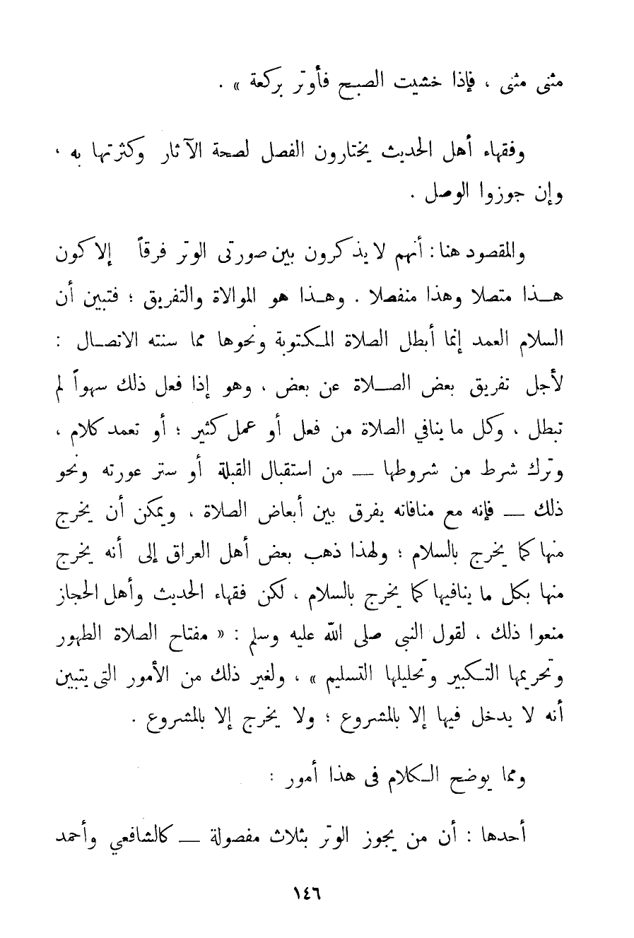 مَثْنَى مَثْنَى فَإِذَا خَشِيت الصُّبْحَ فَأَوْتِرْ بِرَكْعَةِ} . وَفُقَهَاءُ أَهْلِ الْحَدِيثِ يَخْتَارُونَ الْفَصْلَ لِصِحَّةِ الْآثَارِ وَكَثْرَتِهَا بِهِ وَإِنْ جَوَّزُوا الْوَصْلَ. وَالْمَقْصُودُ هُنَا: أَنَّهُمْ لَا يَذْكُرُونَ بَيْنَ صُورَتَيْ الْوِتْرِ فَرْقًا: إلَّا كَوْنَ هَذَا مُتَّصِلًا وَهَذَا مُنْفَصِلًا. وَهَذَا هُوَ الْمُوَالَاةُ وَالتَّفْرِيقُ؛ فَتُبَيِّنُ أَنَّ السَّلَامَ الْعَمْدَ إنَّمَا أَبْطَلَ الصَّلَاةَ الْمَكْتُوبَةَ وَنَحْوَهَا مِمَّا سُنَّتُهُ الِاتِّصَالُ: لِأَجْلِ تَفْرِيقِ بَعْضِ الصَّلَاةِ عَنْ بَعْضٍ وَهُوَ إذَا فَعَلَ ذَلِكَ سَهْوًا لَمْ تَبْطُلْ وَكُلُّ مَا يُنَافِي الصَّلَاةَ مِنْ فِعْلٍ أَوْ عَمَلٍ كَثِيرٍ؛ أَوْ تَعَمُّدِ كَلَامٍ وَتَرْكِ شَرْطٍ مِنْ شُرُوطِهَا - مِنْ اسْتِقْبَالِ الْقِبْلَةِ أَوْ سَتْرِ عَوْرَتِهِ وَنَحْوِ ذَلِكَ - فَإِنَّهُ مَعَ مُنَافَاتِهِ بِفَرْقِ بَيْنَ أَبْعَاضِ الصَّلَاةِ وَيُمْكِنُ أَنْ يَخْرُجَ مِنْهَا كَمَا يَخْرُجُ بِالسَّلَامِ؛ وَلِهَذَا ذَهَبَ بَعْضُ أَهْلِ الْعِرَاقِ إلَى أَنَّهُ يَخْرُجُ مِنْهَا بِكُلِّ مَا يُنَافِيهَا كَمَا يَخْرُجُ بِالسَّلَامِ لَكِنَّ فُقَهَاءَ الْحَدِيثِ وَأَهْلَ الْحِجَازِ مَنَعُوا ذَلِكَ لِقَوْلِ النَّبِيِّ صَلَّى اللَّهُ عَلَيْهِ وَسَلَّمَ {مِفْتَاحُ الصَّلَاةِ الطَّهُورُ وَتَحْرِيمُهَا التَّكْبِيرُ وَتَحْلِيلُهَا التَّسْلِيمُ} وَلِغَيْرِ ذَلِكَ مِنْ الْأُمُورِ الَّتِي يَتَبَيَّنُ أَنَّهُ لَا يَدْخُلُ فِيهَا إلَّا بِالْمَشْرُوعِ؛ وَلَا يَخْرُجُ إلَّا بِالْمَشْرُوعِ. وَمِمَّا يُوَضِّحُ الْكَلَامَ فِي هَذَا أُمُورٌ: أَحَدُهَا: أَنَّ مَنْ يُجَوِّزُ الْوِتْرَ بِثَلَاثِ مَفْصُولَةٍ - كَالشَّافِعِيِّ وَأَحْمَد