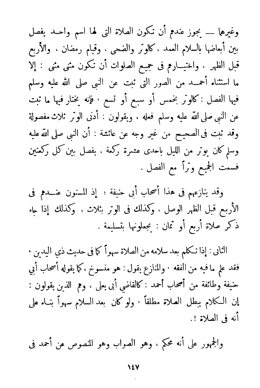 وَغَيْرِهِمَا - يَجُوزُ عِنْدَهُمْ أَنْ تَكُونَ الصَّلَاةُ الَّتِي لَهَا اسْمٌ وَاحِدٌ يَفْصِلُ بَيْنَ أَبْعَاضِهَا بِالسَّلَامِ الْعَمْدِ كَالْوِتْرِ وَالضُّحَى وَقِيَامِ رَمَضَانَ وَالْأَرْبَعِ قَبْلَ الظُّهْرِ وَاخْتِيَارُهُمْ فِي جَمِيعِ الصَّلَوَاتِ أَنْ تَكُونَ مَثْنَى مَثْنَى: إلَّا مَا اسْتَثْنَاهُ أَحْمَد مِنْ الصُّوَرِ الَّتِي ثَبَتَ عَنْ النَّبِيِّ صَلَّى اللَّهُ عَلَيْهِ وَسَلَّمَ فِيهَا الْفَصْلُ: كَالْوِتْرِ بِخَمْسِ أَوْ سَبْعٍ أَوْ تِسْعٍ فَإِنَّهُ يَخْتَارُ فِيهَا مَا ثَبَتَ عَنْ النَّبِيِّ صَلَّى اللَّهُ عَلَيْهِ وَسَلَّمَ فِعْلُهُ وَيَقُولُونَ: أَدْنَى الْوِتْرِ ثَلَاثٌ مَفْصُولَةٌ وَقَدْ ثَبَتَ فِي الصَّحِيحِ مِنْ غَيْرِ وَجْهٍ عَنْ عَائِشَةَ: {أَنَّ النَّبِيَّ صَلَّى اللَّهُ عَلَيْهِ وَسَلَّمَ كَانَ يُوتِرُ مِنْ اللَّيْلِ بِإِحْدَى عَشْرَةَ رَكْعَةً يَفْصِلُ بَيْن كُلِّ رَكْعَتَيْنِ} فَسُمَّتْ الْجَمِيعُ وِتْرًا مَعَ الْفَصْلِ. وَقَدْ يُنَازِعُهُمْ فِي هَذَا أَصْحَابُ أَبِي حَنِيفَةَ؛ إذْ الْمَسْنُونُ عِنْدَهُمْ فِي الْأَرْبَعِ قَبْلَ الظُّهْرِ الْوَصْلُ وَكَذَلِكَ فِي الْوِتْرِ بِثَلَاثِ وَكَذَلِكَ إذَا جَاءَ ذِكْرُ صَلَاةِ أَرْبَعٍ أَوْ ثَمَانٍ: يَجْعَلُونَهَا بِتَسْلِيمَةٍ. الثَّانِي: إذَا تَكَلَّمَ بَعْدَ سَلَامِهِ مِنْ الصَّلَاةِ سَهْوًا كَمَا فِي حَدِيثِ ذِي الْيَدَيْنِ فَقَدْ عُلِمَ مَا فِيهِ مِنْ الْفِقْهِ وَالْمُنَازِعُ يَقُولُ: هُوَ مَنْسُوخٌ كَمَا يَقُولُهُ أَصْحَابُ أَبِي حَنِيفَةَ وَطَائِفَةٌ مِنْ أَصْحَابِ أَحْمَد: كَالْقَاضِي أَبِي يَعْلَى وَهُمْ الَّذِينَ يَقُولُونَ: إنَّ الْكَلَامَ يُبْطِلُ الصَّلَاةَ مُطْلَقًا وَلَوْ كَانَ بَعْدَ السَّلَامِ سَهْوًا بِنَاءً عَلَى أَنَّهُ فِي الصَّلَاةِ. وَالْجُمْهُورُ عَلَى أَنَّهُ مُحْكَمٌ وَهُوَ الصَّوَابُ وَهُوَ الْمَنْصُوصُ عَنْ أَحْمَد فِي
