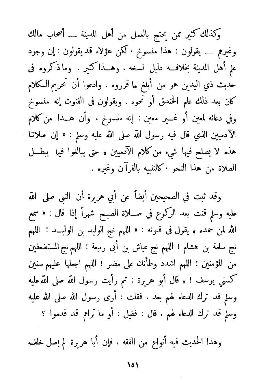 وَكَذَلِكَ كَثِيرٌ مِمَّنْ يَحْتَجُّ بِالْعَمَلِ مِنْ أَهْلِ الْمَدِينَةِ - أَصْحَابِ مَالِكٍ وَغَيْرِهِمْ - يَقُولُونَ: هَذَا مَنْسُوخٌ لَكِنَّ هَؤُلَاءِ قَدْ يَقُولُونَ: إنَّ وُجُودَ عِلْمِ أَهْلِ الْمَدِينَةِ بِخِلَافِهِ دَلِيلُ نَسْخِهِ وَهَذَا كَثِيرٌ. وَمَا ذَكَرُوهُ فِي حَدِيثِ ذِي الْيَدَيْنِ هُوَ مِنْ أَبْلَغِ مَا قَرَّرُوهُ وَادَّعَوْا أَنَّ تَحْرِيمَ الْكَلَامِ كَانَ بَعْدَ ذَلِكَ عَامَ الْخَنْدَقِ أَوْ نَحْوَهُ وَيَقُولُونَ فِي الْقُنُوتِ إنَّهُ مَنْسُوخٌ وَفِي دُعَائِهِ لِمُعَيَّنِ أَوْ غَيْرِ مُعَيَّنٍ: إنَّهُ مَنْسُوخٌ وَإِنَّ هَذَا مِنْ كَلَامِ الْآدَمِيِّينَ الَّذِي قَالَ فِيهِ رَسُولُ اللَّهِ صَلَّى اللَّهُ عَلَيْهِ وَسَلَّمَ {إنَّ صَلَاتَنَا هَذِهِ لَا يَصْلُحُ فِيهَا شَيْءٌ مِنْ كَلَامِ الْآدَمِيِّينَ} حَتَّى يُبَالِغُوا فِيمَا يُبْطِلُ الصَّلَاةَ مِنْ هَذَا النَّحْوِ كَالتَّنْبِيهِ بِالْقُرْآنِ وَغَيْرِهِ.