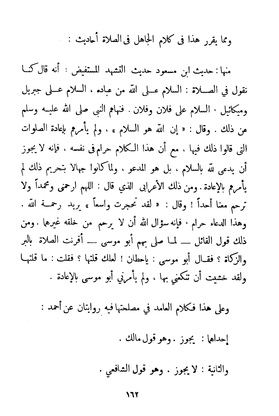 وَمِمَّا يُقَرِّرُ هَذَا فِي كَلَامِ الْجَاهِلِ فِي الصَّلَاةِ أَحَادِيثُ: مِنْهَا: حَدِيثُ ابْنِ مَسْعُودٍ حَدِيثُ التَّشَهُّدِ الْمُسْتَفِيضِ: {أَنَّهُ قَالَ كُنَّا نَقُولُ فِي الصَّلَاةِ: السَّلَامُ عَلَى اللَّهِ مِنْ عِبَادِهِ السَّلَامُ عَلَى جِبْرِيلَ وميكائيل السَّلَامُ عَلَى فُلَانٍ وَفُلَانٍ. فَنَهَاهُمْ النَّبِيُّ صَلَّى اللَّهُ عَلَيْهِ وَسَلَّمَ عَنْ ذَلِكَ. وَقَالَ: إنَّ اللَّهَ هُوَ السَّلَامُ} وَلَمْ يَأْمُرْهُمْ بِإِعَادَةِ الصَّلَوَاتِ الَّتِي قَالُوا ذَلِكَ فِيهَا مَعَ أَنَّ هَذَا الْكَلَامَ حَرَامٌ فِي نَفْسِهِ فَإِنَّهُ لَا يَجُوزُ أَنْ يُدْعَى لِلَّهِ بِالسَّلَامِ بَلْ هُوَ الْمَدْعُوُّ وَلَمَّا كَانُوا جُهَّالًا بِتَحْرِيمِ ذَلِكَ لَمْ يَأْمُرْهُمْ بِالْإِعَادَةِ. وَمِنْ ذَلِكَ الْأَعْرَابِيُّ الَّذِي قَالَ: اللَّهُمَّ ارْحَمْنِي وَمُحَمَّدًا وَلَا تَرْحَمْ مَعَنَا أَحَدًا وَقَالَ: " لَقَدْ تَحَجَّرْت وَاسِعًا " يُرِيدُ رَحْمَةَ اللَّهِ. وَهَذَا الدُّعَاءُ حَرَامٌ فَإِنَّهُ سُؤَالُ اللَّهِ أَنْ لَا يَرْحَمَ مِنْ خَلْقِهِ غَيْرَهُمَا. وَمِنْ ذَلِكَ قَوْلُ الْقَائِلِ - لَمَّا صَلَّى بِهِمْ أَبُو مُوسَى - أَقَرَنْت الصَّلَاةَ بِالْبِرِّ وَالزَّكَاةِ؟ فَقَالَ أَبُو مُوسَى: يَا حطان لَعَلَّك قُلْتهَا؟ فَقُلْت: مَا قُلْتهَا وَلَقَدْ خَشِيت أَنْ تَبْكَعَنِي بِهَا وَلَمْ يَأْمُرْنِي أَبُو مُوسَى بِالْإِعَادَةِ. وَعَلَى هَذَا فَكَلَامُ الْعَامِدِ فِي مَصْلَحَتِهَا فِيهِ رِوَايَتَانِ عَنْ أَحْمَد: إحْدَاهُمَا: يَجُوزُ. وَهُوَ قَوْلُ مَالِكٍ. وَالثَّانِيَةُ: لَا يَجُوزُ. وَهُوَ قَوْلُ الشَّافِعِيِّ.