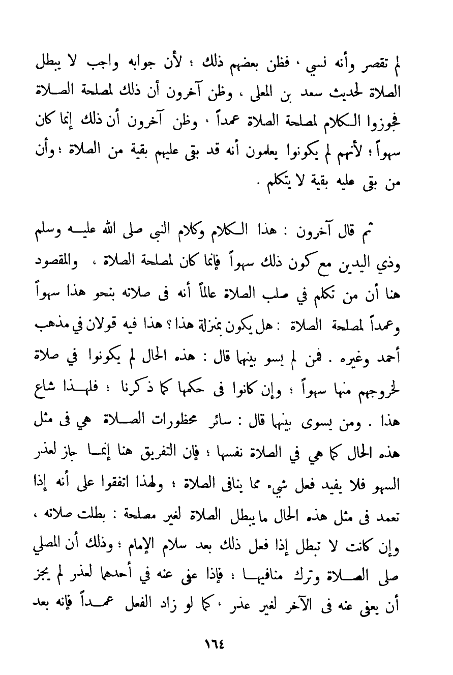 لَمْ تَقْصُرْ وَأَنَّهُ نَسِيَ فَظَنَّ بَعْضُهُمْ ذَلِكَ؛ لِأَنَّ جَوَابَهُ وَاجِبٌ لَا يُبْطِلُ الصَّلَاةَ لِحَدِيثِ أَبِي سَعْيدِ بْنِ الْمُعَلَّى وَظَنَّ آخَرُونَ أَنَّ ذَلِكَ لِمَصْلَحَةِ الصَّلَاةِ فَجَوَّزُوا الْكَلَامَ لِمَصْلَحَةِ الصَّلَاةِ عَمْدًا وَظَنَّ آخَرُونَ أَنَّ ذَلِكَ إنَّمَا كَانَ سَهْوًا؛ لِأَنَّهُمْ لَمْ يَكُونُوا يَعْلَمُونَ أَنَّهُ قَدْ بَقِيَ عَلَيْهِمْ بَقِيَّةٌ مِنْ الصَّلَاةِ؛ وَأَنَّ مَنْ بَقِيَ عَلَيْهِ بَقِيَّةٌ لَا يَتَكَلَّمُ. ثُمَّ قَالَ آخَرُونَ: هَذَا الْكَلَامُ وَكَلَامُ النَّبِيِّ صَلَّى اللَّهُ عَلَيْهِ وَسَلَّمَ وَذِي الْيَدَيْنِ مَعَ كَوْنِ ذَلِكَ سَهْوًا: فَإِنَّمَا كَانَ لِمَصْلَحَةِ الصَّلَاةِ وَالْمَقْصُودُ هُنَا أَنَّ مَنْ تَكَلَّمَ فِي صُلْبِ الصَّلَاةِ عَالِمًا أَنَّهُ فِي صَلَاتِهِ بِنَحْوِ هَذَا سَهْوًا وَعَمْدًا لِمَصْلَحَةِ الصَّلَاةِ: هَلْ يَكُونُ بِمَنْزِلَةِ هَذَا؟ هَذَا فِيهِ قَوْلَانِ فِي مَذْهَبِ أَحْمَد وَغَيْرِهِ. فَمَنْ لَمْ يُسَوِّ بَيْنَهُمَا قَالَ: هَذِهِ الْحَالُ لَمْ يَكُونُوا فِي صَلَاةٍ لِخُرُوجِهِمْ مِنْهَا سَهْوًا؛ وَإِنْ كَانُوا فِي حُكْمِهَا كَمَا ذَكَرْنَا؛ فَلِهَذَا شَاعَ هَذَا. وَمَنْ يُسَوِّي بَيْنَهُمَا قَالَ: سَائِرُ مَحْظُورَاتِ الصَّلَاةِ هِيَ فِي مِثْلِ هَذِهِ الْحَالِ كَمَا هِيَ فِي الصَّلَاةِ نَفْسِهَا؛ فَإِنَّ التَّفْرِيقَ هُنَا إنَّمَا جَازَ لِعُذْرِ السَّهْوِ فَلَا يُفِيدُ فِعْلَ شَيْءٍ مِمَّا يُنَافِي الصَّلَاةَ؛ وَلِهَذَا اتَّفَقُوا عَلَى أَنَّهُ إذَا تَعَمَّدَ فِي مِثْلِ هَذِهِ الْحَالِ مَا يُبْطِلُ الصَّلَاةَ لِغَيْرِ مَصْلَحَةٍ: بَطَلَتْ صَلَاتُهُ وَإِنْ كَانَتْ لَا تَبْطُلُ إذَا فَعَلَ ذَلِكَ بَعْدَ سَلَامِ الْإِمَامِ؛ وَذَلِكَ أَنَّ الْمُصَلِّيَ صَلَّى الصَّلَاةَ وَتَرَكَ مَنَافِيَهَا؛ فَإِذَا عُفِيَ عَنْهُ فِي أَحَدِهِمَا لِعُذْرِ لَمْ يَجُزْ أَنْ يُعْفَى عَنْهُ فِي الْآخَرِ لِغَيْرِ عُذْرٍ كَمَا لَوْ زَادَ الْفِعْلَ عَمْدًا فَإِنَّهُ بَعْدَ