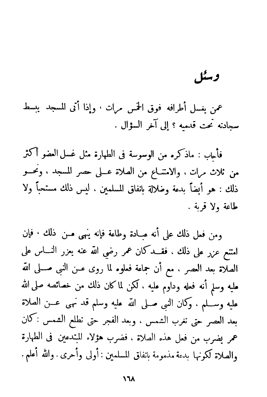 مَا ذَكَرَهُ مِنْ الْوَسْوَسَةِ فِي الطَّهَارَةِ مِثْلُ غَسْلِ الْعُضْوِ أَكْثَرَ مِنْ ثَلَاثِ مَرَّاتٍ وَالِامْتِنَاعِ مِنْ الصَّلَاةِ عَلَى حُصْرِ الْمَسْجِدِ وَنَحْوِ ذَلِكَ: هُوَ أَيْضًا بِدْعَةٌ وَضَلَالَةٌ بِاتِّفَاقِ الْمُسْلِمِينَ لَيْسَ ذَلِكَ مُسْتَحَبًّا وَلَا طَاعَةً وَلَا قُرْبَةً. وَمَنْ فَعَلَ ذَلِكَ عَلَى أَنَّهُ عِبَادَةٌ وَطَاعَةٌ فَإِنَّهُ يُنْهَى عَنْ ذَلِكَ فَإِنْ امْتَنَعَ عُزِّرَ عَلَى ذَلِكَ فَقَدْ كَانَ عُمَرُ رَضِيَ اللَّهُ عَنْهُ يُعَزِّرُ النَّاسَ عَلَى الصَّلَاةِ بَعْدَ الْعَصْرِ مَعَ أَنَّ جَمَاعَةً فَعَلُوهُ لِمَا رُوِيَ عَنْ النَّبِيِّ صَلَّى اللَّهُ عَلَيْهِ وَسَلَّمَ أَنَّهُ فَعَلَهُ وَدَاوَمَ عَلَيْهِ لَكِنْ لَمَّا كَانَ ذَلِكَ مِنْ خَصَائِصِهِ صَلَّى اللَّهُ عَلَيْهِ وَسَلَّمَ {وَكَانَ النَّبِيُّ صَلَّى اللَّهُ عَلَيْهِ وَسَلَّمَ قَدْ نَهَى عَنْ الصَّلَاةِ بَعْدَ الْعَصْرِ حَتَّى تَغْرُبَ الشَّمْسُ وَبَعْدَ الْفَجْرِ حَتَّى تَطْلُعَ الشَّمْسُ} كَانَ عُمَرُ يَضْرِبُ مَنْ فَعَلَ هَذِهِ الصَّلَاةِ فَضَرَبَ هَؤُلَاءِ الْمُبْتَدِعِينَ فِي الطَّهَارَةِ وَالصَّلَاةِ لِكَوْنِهَا بِدْعَةً مَذْمُومَةً بِاتِّفَاقِ الْمُسْلِمِينَ: أَوْلَى وَأَحْرَى. وَاَللَّهُ أَعْلَمُ.
