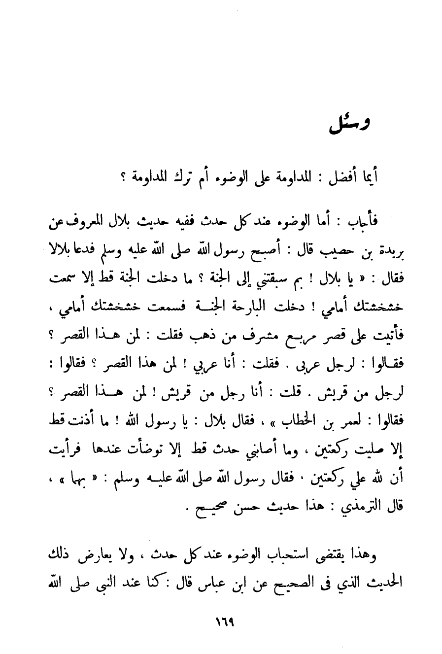 فَأَجَابَ: أَمَّا الْوُضُوءُ عِنْدَ كُلِّ حَدَثٍ فَفِيهِ حَدِيثُ بِلَالٍ الْمَعْرُوفُ عَنْ بريدة بْنِ حصيب قَالَ: {أَصْبَحَ رَسُولُ اللَّهِ صَلَّى اللَّهُ عَلَيْهِ وَسَلَّمَ فَدَعَا بِلَالًا فَقَالَ: يَا بِلَالُ بِمَ سَبَقْتنِي إلَى الْجَنَّةِ؟ مَا دَخَلْت الْجَنَّةَ قَطُّ إلَّا سَمِعْت خَشْخَشَتَك أَمَامِي دَخَلْت الْبَارِحَةَ الْجَنَّةَ فَسَمِعْت خَشْخَشَتَك أَمَامِي فَأَتَيْت عَلَى قَصْرٍ مُرَبَّعٍ مُشْرِفٍ مِنْ ذَهَبٍ فَقُلْت: لِمَنْ هَذَا الْقَصْرُ؟ فَقَالُوا: لِرَجُلِ عَرَبِيٍّ. فَقُلْت: أَنَا عَرَبِيٌّ لِمَنْ هَذَا الْقَصْرُ؟ فَقَالُوا: لِرَجُلِ مِنْ قُرَيْشٍ. قُلْت: أَنَا رَجُلٌ مِنْ قُرَيْشٍ لِمَنْ هَذَا الْقَصْرُ؟ فَقَالُوا: لِعُمَرِ بْنِ الْخَطَّابِ فَقَالَ بِلَالٌ: يَا رَسُولَ اللَّهِ مَا أَذَّنْت قَطُّ إلَّا صَلَّيْت رَكْعَتَيْنِ وَمَا أَصَابَنِي حَدَثٌ قَطُّ إلَّا تَوَضَّأْت عِنْدَهَا فَرَأَيْت أَنَّ لِلَّهِ عَلَيَّ رَكْعَتَيْنِ فَقَالَ رَسُولُ اللَّهِ صَلَّى اللَّهُ عَلَيْهِ وَسَلَّمَ بِهِمَا} قَالَ التِّرْمِذِيُّ: هَذَا حَدِيثٌ حَسَنٌ صَحِيحٌ. وَهَذَا يَقْتَضِي اسْتِحْبَابَ الْوُضُوءِ عِنْدَ كُلِّ حَدَثٍ وَلَا يُعَارِضُ ذَلِكَ الْحَدِيثَ الَّذِي فِي الصَّحِيحِ عَنْ {ابْنِ عَبَّاسٍ قَالَ: كُنَّا عِنْدَ النَّبِيِّ