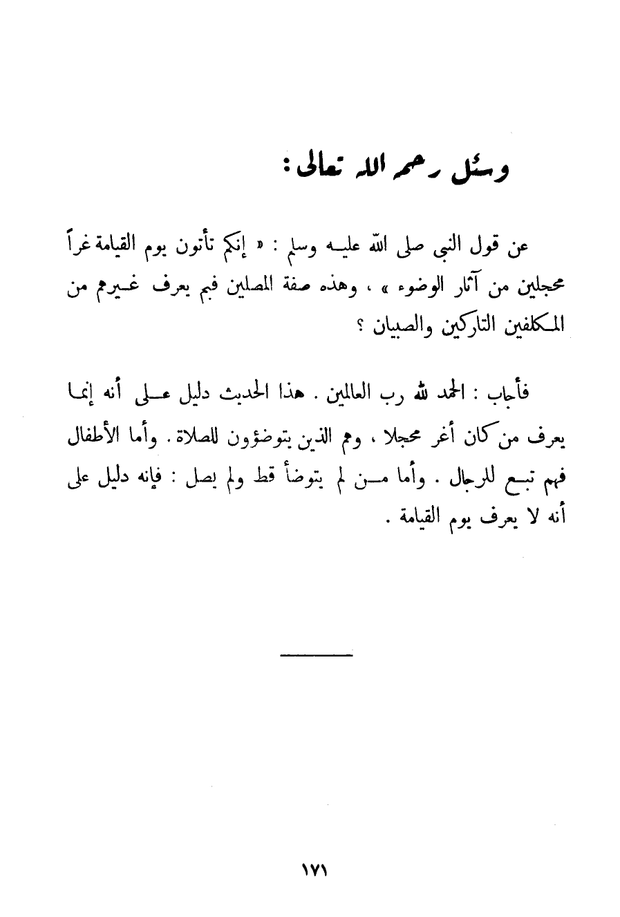 عَنْ قَوْلِ النَّبِيِّ صَلَّى اللَّهُ عَلَيْهِ وَسَلَّمَ {إنَّكُمْ تَأْتُونَ يَوْمَ الْقِيَامَةِ غُرًّا مُحَجَّلِينَ مِنْ آثَارِ الْوُضُوءِ} وَهَذِهِ صِفَةُ الْمُصَلِّينَ فَبِمَ يُعْرَفُ غَيْرُهُمْ مِنْ الْمُكَلَّفِينَ التَّارِكِينَ وَالصِّبْيَانِ؟ .