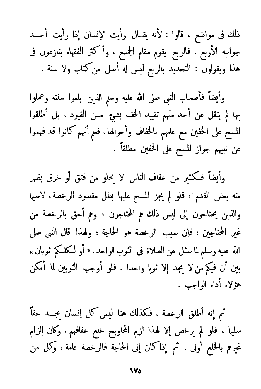 ذَلِكَ فِي مَوَاضِعَ قَالُوا: لِأَنَّهُ يُقَالُ رَأَيْت الْإِنْسَانَ إذَا رَأَيْت أَحَدَ جَوَانِبِهِ الْأَرْبَعِ فَالرُّبُعُ يَقُومُ مَقَامَ الْجَمِيعِ وَأَكْثَرُ الْفُقَهَاءِ يُنَازِعُونَ فِي هَذَا وَيَقُولُونَ: التَّحْدِيدُ بِالرُّبُعِ لَيْسَ لَهُ أَصْلٌ مِنْ كِتَابٍ وَلَا سُنَّةٍ. وَأَيْضًا فَأَصْحَابُ النَّبِيِّ صَلَّى اللَّهُ عَلَيْهِ وَسَلَّمَ الَّذِينَ بَلَّغُوا سُنَّتَهُ وَعَمِلُوا بِهَا لَمْ يُنْقَلْ عَنْ أَحَدٍ مِنْهُمْ تَقْيِيدُ الْخُفِّ بِشَيْءِ مِنْ الْقُيُودِ بَلْ أَطْلَقُوا الْمَسْحَ عَلَى الْخُفَّيْنِ مَعَ عِلْمِهِمْ بِالْخِفَافِ وَأَحْوَالِهَا فَعُلِمَ أَنَّهُمْ كَانُوا قَدْ فَهِمُوا عَنْ نَبِيِّهِمْ جَوَازَ الْمَسْحِ عَلَى الْخُفَّيْنِ مُطْلَقًا. وَأَيْضًا فَكَثِيرٌ مِنْ خِفَافِ النَّاسِ لَا يَخْلُو مِنْ فَتْقٍ أَوْ خَرْقٍ يَظْهَرُ مِنْهُ بَعْضُ الْقَدَمِ؛ فَلَوْ لَمْ يَجُزْ الْمَسْحُ عَلَيْهَا بَطَلَ مَقْصُودُ الرُّخْصَةِ لَا سِيَّمَا وَاَلَّذِينَ يَحْتَاجُونَ إلَى لُبْسِ ذَلِكَ هُمْ الْمُحْتَاجُونَ؛ وَهُمْ أَحَقُّ بِالرُّخْصَةِ مِنْ غَيْرِ الْمُحْتَاجِينَ؛ فَإِنَّ سَبَبَ الرُّخْصَةِ هُوَ الْحَاجَةُ؛ وَلِهَذَا قَالَ النَّبِيُّ صَلَّى اللَّهُ عَلَيْهِ وَسَلَّمَ لَمَّا سُئِلَ عَنْ الصَّلَاةِ فِي الثَّوْبِ الْوَاحِدِ: {أَوَلِكُلِّكُمْ ثَوْبَانِ} بَيَّنَ أَنَّ فِيكُمْ مَنْ لَا يَجِدُ إلَّا ثَوْبًا وَاحِدًا فَلَوْ أَوْجَبَ الثَّوْبَيْنِ لَمَا أَمْكَنَ هَؤُلَاءِ أَدَاءُ الْوَاجِبِ. ثُمَّ إنَّهُ أَطْلَقَ الرُّخْصَةَ فَكَذَلِكَ هُنَا لَيْسَ كُلُّ إنْسَانٍ يَجِدُ خُفًّا سَلِيمًا فَلَوْ لَمْ يُرَخِّصْ إلَّا لِهَذَا لَزِمَ الْمَحَاوِيجَ خَلْعُ خِفَافِهِمْ وَكَانَ إلْزَامُ غَيْرِهِمْ بِالْخَلْعِ أَوْلَى. ثُمَّ إذَا كَانَ إلَى الْحَاجَةِ فَالرُّخْصَةُ عَامَّةٌ.وَكُلُّ مَنْ