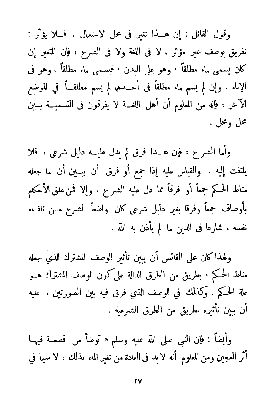وَقَوْلُ الْقَائِلِ: إنَّ هَذَا تَغَيُّرٌ فِي مَحَلِّ الِاسْتِعْمَالِ فَلَا يُؤَثِّرُ: تَفْرِيقٌ بِوَصْفِ غَيْرِ مُؤَثِّرٍ لَا فِي اللُّغَةِ وَلَا فِي الشَّرْعِ؛ فَإِنَّ الْمُتَغَيِّرَ إنْ كَانَ يُسَمَّى مَاءً مُطْلَقًا وَهُوَ عَلَى الْبَدَنِ فَيُسَمَّى مَاءً مُطْلَقًا وَهُوَ فِي الْإِنَاءِ. وَإِنْ لَمْ يُسَمَّ مَاءً مُطْلَقًا فِي أَحَدِهِمَا لَمْ يُسَمَّ مُطْلَقًا فِي الْمَوْضِعِ الْآخَرِ؛ فَإِنَّهُ مِنْ الْمَعْلُومِ أَنَّ أَهْلَ اللُّغَةِ لَا يُفَرِّقُونَ فِي التَّسْمِيَةِ بَيْنَ مَحَلٍّ وَمَحَلٍّ. وَأَمَّا الشَّرْعُ: فَإِنَّ هَذَا فَرْقٌ لَمْ يَدُلَّ عَلَيْهِ دَلِيلٌ شَرْعِيٌّ فَلَا يُلْتَفَتُ إلَيْهِ. وَالْقِيَاسُ عَلَيْهِ إذَا جُمِعَ أَوْ فُرِّقَ: أَنْ يُبَيَّنَ أَنَّ مَا جَعَلَهُ مَنَاطَ الْحُكْمِ جَمْعًا أَوْ فَرْقًا مِمَّا دَلَّ عَلَيْهِ الشَّرْعُ وَإِلَّا فَمَنْ عَلَّقَ الْأَحْكَامَ بِأَوْصَافِ جَمْعًا وَفَرْقًا بِغَيْرِ دَلِيلٍ شَرْعِيٍّ: كَانَ وَاضِعًا لِشَرْعِ مِنْ تِلْقَاءِ نَفْسِهِ شَارِعًا فِي الدِّينِ مَا لَمْ يَأْذَنْ بِهِ اللَّهُ. وَلِهَذَا كَانَ عَلَى الْقَائِسِ أَنْ يُبَيِّنَ تَأْثِيرَ الْوَصْفِ الْمُشْتَرَكِ الَّذِي جَعَلَهُ مَنَاطَ الْحُكْمِ بِطَرِيقِ مِنْ الطُّرُقِ الدَّالَّةِ عَلَى كَوْنِ الْوَصْفِ الْمُشْتَرَكِ هُوَ عِلَّةَ الْحُكْمِ. وَكَذَلِكَ فِي الْوَصْفِ الَّذِي فُرِّقَ فِيهِ بَيْنَ الصُّورَتَيْنِ عَلَيْهِ أَنْ يُبَيِّنَ تَأْثِيرَهُ بِطَرِيقِ مِنْ الطُّرُقِ الشَّرْعِيَّةِ. وَأَيْضًا: فَإِنَّ النَّبِيَّ صَلَّى اللَّهُ عَلَيْهِ وَسَلَّمَ {تَوَضَّأَ مِنْ قَصْعَةٍ فِيهَا أَثَرُ الْعَجِينِ} وَمِنْ الْمَعْلُومِ أَنَّهُ: لَا بُدَّ فِي الْعَادَةِ مِنْ تَغَيُّرِ الْمَاءِ بِذَلِكَ لَا سِيَّمَا فِي