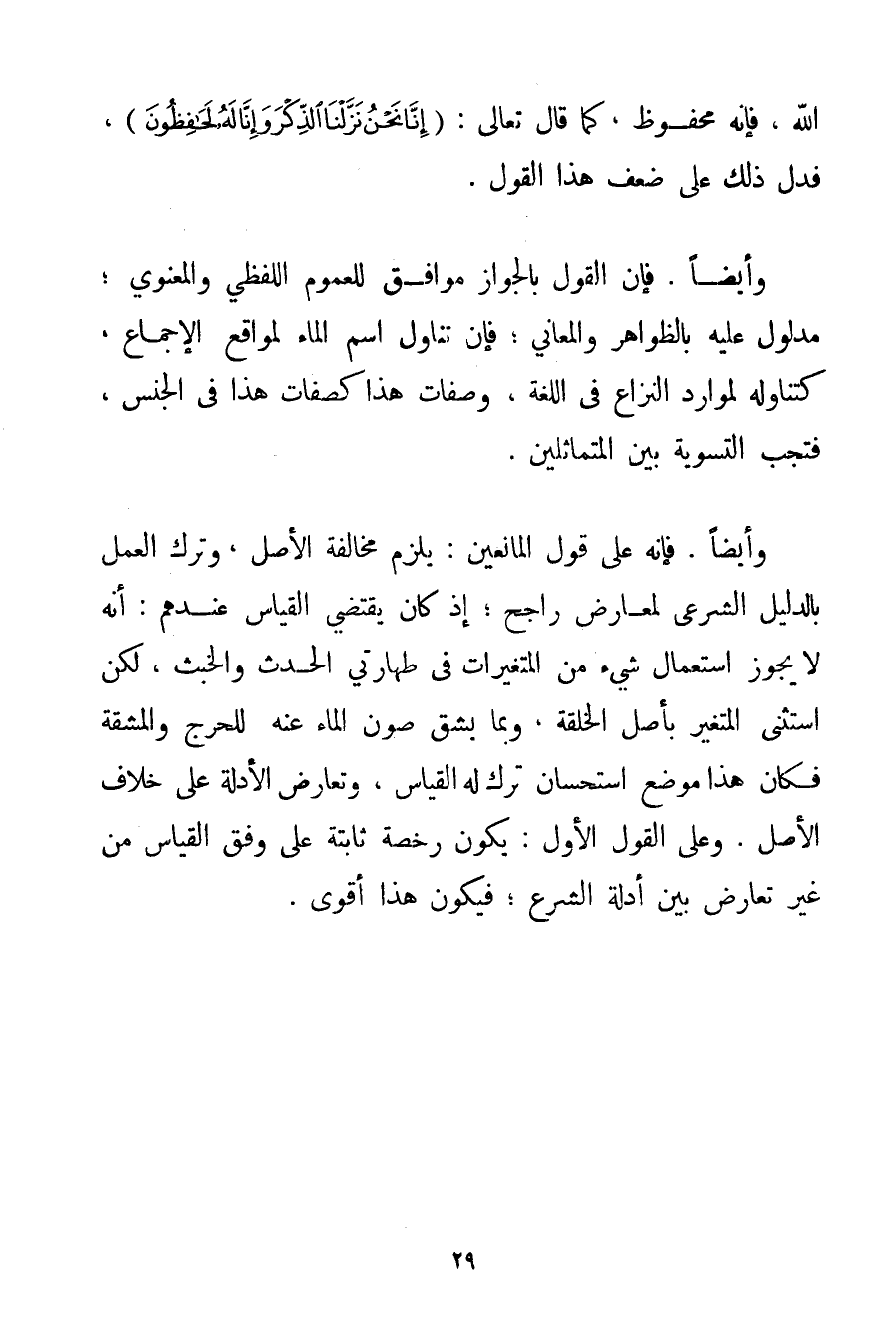 اللَّهِ فَإِنَّهُ مَحْفُوظٌ كَمَا قَالَ تَعَالَى: {إنَّا نَحْنُ نَزَّلْنَا الذِّكْرَ وَإِنَّا لَهُ لَحَافِظُونَ} فَدَلَّ ذَلِكَ عَلَى ضَعْفِ هَذَا الْقَوْلِ. وَأَيْضًا. فَإِنَّ الْقَوْلَ بِالْجَوَازِ مُوَافِقٌ لِلْعُمُومِ اللَّفْظِيِّ وَالْمَعْنَوِيِّ؛ مَدْلُولٌ عَلَيْهِ بِالظَّوَاهِرِ وَالْمَعَانِي؛ فَإِنَّ تَنَاوُلَ اسْمِ الْمَاءِ لِمَوَاقِعِ الْإِجْمَاعِ كَتَنَاوُلِهِ لِمَوَارِدِ النِّزَاعِ فِي اللُّغَةِ وَصِفَاتُ هَذَا كَصِفَاتِ هَذَا فِي الْجِنْسِ فَتَجِبُ التَّسْوِيَةُ بَيْنَ الْمُتَمَاثِلَيْنِ. وَأَيْضًا. فَإِنَّهُ عَلَى قَوْلِ الْمَانِعِينَ: يَلْزَمُ مُخَالَفَةُ الْأَصْلِ وَتَرْكُ الْعَمَلِ بِالدَّلِيلِ الشَّرْعِيِّ لِمُعَارِضِ رَاجِحٍ؛ إذْ كَانَ يَقْتَضِي الْقِيَاسُ عِنْدَهُمْ: أَنَّهُ لَا يَجُوزُ اسْتِعْمَالُ شَيْءٍ مِنْ الْمُتَغَيِّرَاتِ فِي طَهَارَتَيْ الْحَدَثِ وَالْخَبَثِ لَكِنْ اُسْتُثْنِيَ الْمُتَغَيِّرُ بِأَصْلِ الْخِلْقَةِ وَبِمَا يَشُقُّ صَوْنُ الْمَاءِ عَنْهُ لِلْحَرَجِ وَالْمَشَقَّةِ فَكَانَ هَذَا مَوْضِعَ اسْتِحْسَانٍ تُرِكَ لَهُ الْقِيَاسُ وَتَعَارُضُ الْأَدِلَّةِ عَلَى خِلَافِ الْأَصْلِ. وَعَلَى الْقَوْلِ الْأَوَّلِ: يَكُونُ رُخْصَةً ثَابِتَةً عَلَى وَفْقِ الْقِيَاسِ مِنْ غَيْرِ تَعَارُضٍ بَيْنَ أَدِلَّةِ الشَّرْعِ؛ فَيَكُونُ هَذَا أَقْوَى.