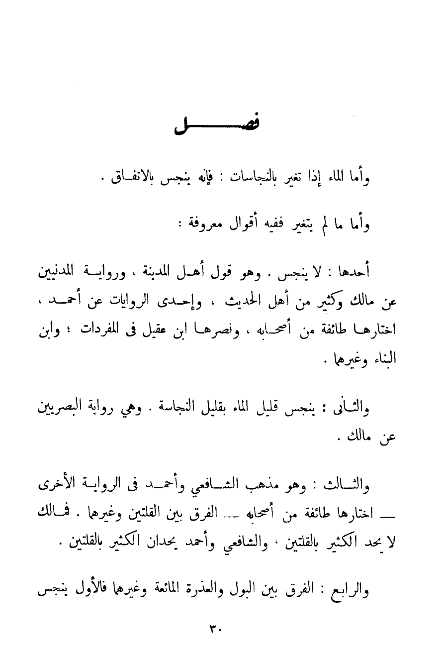 وَأَمَّا الْمَاءُ إذَا تَغَيَّرَ بِالنَّجَاسَاتِ: فَإِنَّهُ يَنْجُسُ بِالِاتِّفَاقِ. وَأَمَّا مَا لَمْ يَتَغَيَّرْ فَفِيهِ أَقْوَالٌ مَعْرُوفَةٌ: أَحَدُهَا: لَا يَنْجُسُ. وَهُوَ قَوْلُ أَهْلِ الْمَدِينَةِ وَرِوَايَةُ الْمَدَنِيِّينَ عَنْ مَالِكٍ وَكَثِيرٍ مِنْ أَهْلِ الْحَدِيثِ وَإِحْدَى الرِّوَايَاتِ عَنْ أَحْمَد اخْتَارَهَا طَائِفَةٌ مِنْ أَصْحَابِهِ وَنَصَرَهَا ابْنُ عَقِيلٍ فِي الْمُفْرَدَاتِ؛ وَابْنُ الْبَنَّاءِ وَغَيْرُهُمَا. وَالثَّانِي: يَنْجُسُ قَلِيلُ الْمَاءِ بِقَلِيلِ النَّجَاسَةِ. وَهِيَ رِوَايَةُ الْبَصْرِيِّينَ عَنْ مَالِكٍ. وَالثَّالِثُ: وَهُوَ مَذْهَبُ الشَّافِعِيِّ وَأَحْمَد فِي الرِّوَايَةِ الْأُخْرَى - اخْتَارَهَا طَائِفَةٌ مِنْ أَصْحَابِهِ - الْفَرْقُ بَيْنَ الْقُلَّتَيْنِ وَغَيْرِهِمَا. فَمَالِكٌ لَا يَحُدُّ الْكَثِيرَ بِالْقُلَّتَيْنِ وَالشَّافِعِيُّ وَأَحْمَد يَحُدَّانِ الْكَثِيرَ بِالْقُلَّتَيْنِ. وَالرَّابِعُ: الْفَرْقُ بَيْنَ الْبَوْلِ وَالْعَذِرَةِ الْمَائِعَةِ وَغَيْرِهِمَا فَالْأَوَّلُ يُنَجِّسُ