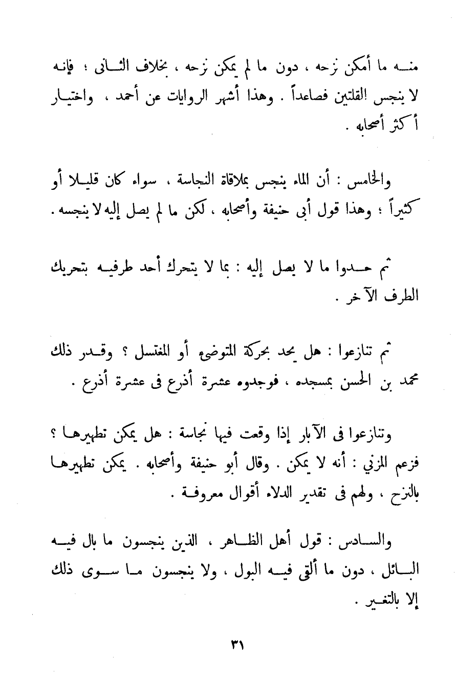 مِنْهُ مَا أَمْكَنَ نَزْحُهُ دُونَ مَا لَمْ يُمْكِنْ نَزْحُهُ بِخِلَافِ الثَّانِي؛ فَإِنَّهُ لَا يُنَجِّسُ الْقُلَّتَيْنِ فَصَاعِدًا. وَهَذَا أَشْهَرُ الرِّوَايَاتِ عَنْ أَحْمَد وَاخْتِيَارُ أَكْثَرِ أَصْحَابِهِ. وَالْخَامِسُ: أَنَّ الْمَاءَ يَنْجُسُ بِمُلَاقَاةِ النَّجَاسَةِ سَوَاءٌ كَانَ قَلِيلًا أَوْ كَثِيرًا؛ وَهَذَا قَوْلُ أَبِي حَنِيفَةَ وَأَصْحَابِهِ لَكِنْ مَا لَمْ يَصِلْ إلَيْهِ لَا يُنَجِّسُهُ. ثُمَّ حَدُّوا مَا لَا يَصِلُ إلَيْهِ: بِمَا لَا يَتَحَرَّكُ أَحَدُ طَرَفَيْهِ بِتَحْرِيكِ الطَّرَفِ الْآخَرِ. ثُمَّ تَنَازَعُوا: هَلْ يُحَدُّ بِحَرَكَةِ الْمُتَوَضِّئِ أَوْ الْمُغْتَسِلِ؟ وَقَدَّرَ ذَلِكَ مُحَمَّدُ بْنُ الْحَسَنِ بِمَسْجِدِهِ فَوَجَدُوهُ عَشَرَةَ أَذْرُعٍ فِي عَشَرَةِ أَذْرُعٍ. وَتَنَازَعُوا فِي الْآبَارِ إذَا وَقَعَتْ فِيهَا نَجَاسَةٌ: هَلْ يُمْكِنُ تَطْهِيرُهَا؟ فَزَعَمَ المزني: أَنَّهُ لَا يُمْكِنُ. وَقَالَ أَبُو حَنِيفَةَ وَأَصْحَابُهُ. يُمْكِنُ تَطْهِيرُهَا بِالنَّزْحِ وَلَهُمْ فِي تَقْدِيرِ الدِّلَاءِ أَقْوَالٌ مَعْرُوفَةٌ. وَالسَّادِسُ: قَوْلُ أَهْلِ الظَّاهِرِ الَّذِينَ يُنَجِّسُونَ مَا بَالَ فِيهِ الْبَائِلُ دُونَ مَا أُلْقِيَ فِيهِ الْبَوْلُ وَلَا يُنَجِّسُونَ مَا سِوَى ذَلِكَ إلَّا بِالتَّغَيُّرِ.