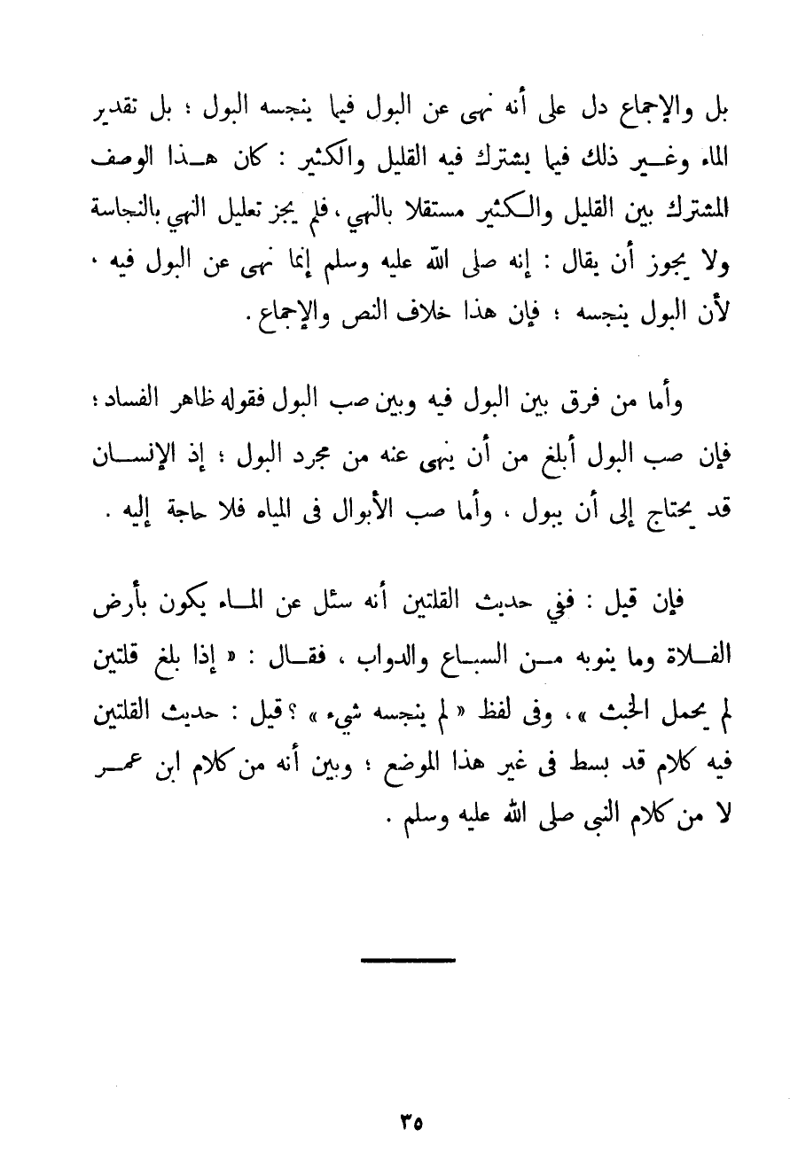 بَلْ وَالْإِجْمَاعُ دَلَّ عَلَى أَنَّهُ نَهَى عَنْ الْبَوْلِ فِيمَا يُنَجِّسُهُ الْبَوْلُ؛ بَلْ تَقْدِيرُ الْمَاءِ وَغَيْرِ ذَلِكَ فِيمَا يَشْتَرِكُ فِيهِ الْقَلِيلُ وَالْكَثِيرُ: كَانَ هَذَا الْوَصْفُ الْمُشْتَرَكُ بَيْنَ الْقَلِيلِ وَالْكَثِيرِ مُسْتَقِلًّا بِالنَّهْيِ فَلَمْ يَجُزْ تَعْلِيلُ النَّهْيِ بِالنَّجَاسَةِ وَلَا يَجُوزُ أَنْ يُقَالَ: إنَّهُ صَلَّى اللَّهُ عَلَيْهِ وَسَلَّمَ إنَّمَا نَهَى عَنْ الْبَوْلِ فِيهِ لِأَنَّ الْبَوْلَ يُنَجِّسُهُ؛ فَإِنَّ هَذَا خِلَافُ النَّصِّ وَالْإِجْمَاعِ. وَأَمَّا مَنْ فَرَّقَ بَيْنَ الْبَوْلِ فِيهِ وَبَيْنَ صَبِّ الْبَوْلِ فَقَوْلُهُ ظَاهِرُ الْفَسَادِ؛ فَإِنَّ صَبَّ الْبَوْلِ أَبْلَغُ مِنْ أَنْ يُنْهَى عَنْهُ مِنْ مُجَرَّدِ الْبَوْلِ؛ إذْ الْإِنْسَانُ قَدْ يَحْتَاجُ إلَى أَنْ يَبُولَ وَأَمَّا صَبُّ الْأَبْوَالِ فِي الْمِيَاهِ فَلَا حَاجَةَ إلَيْهِ. فَإِنْ قِيلَ: فَفِي حَدِيثِ الْقُلَّتَيْنِ أَنَّهُ سُئِلَ عَنْ الْمَاءِ يَكُونُ بِأَرْضِ الْفَلَاةِ وَمَا يَنُوبُهُ مِنْ السِّبَاعِ وَالدَّوَابِّ فَقَالَ: {إذَا بَلَغَ قُلَّتَيْنِ لَمْ يَحْمِلْ الْخَبَثَ} وَفِي لَفْظٍ {لَمْ يُنَجِّسْهُ شَيْءٌ} ؟ قِيلَ: حَدِيثُ الْقُلَّتَيْنِ فِيهِ كَلَامٌ قَدْ بُسِطَ فِي غَيْرِ هَذَا الْمَوْضِعِ؛ وَبُيِّنَ أَنَّهُ مِنْ كَلَامِ ابْنِ عُمَرَ لَا مِنْ كَلَامِ النَّبِيِّ صَلَّى اللَّهُ عَلَيْهِ وَسَلَّمَ.