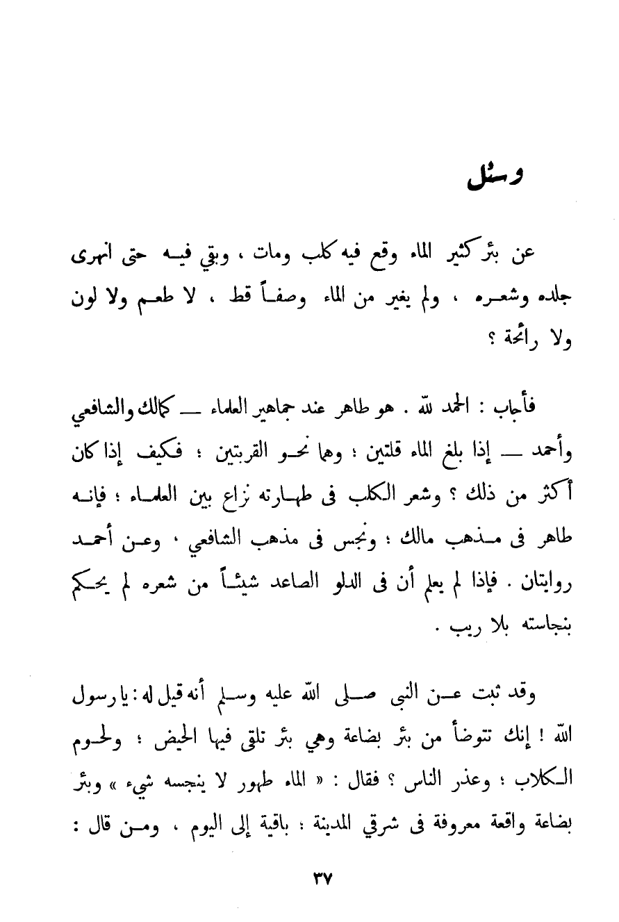 عَنْ بِئْرٍ كَثِيرِ الْمَاءِ وَقَعَ فِيهِ كَلْبٌ وَمَاتَ وَبَقِيَ فِيهِ حَتَّى انهرى جِلْدُهُ وَشَعْرُهُ وَلَمْ يُغَيِّرْ مِنْ الْمَاءِ وَصْفًا قَطُّ لَا طَعْمٌ وَلَا لَوْنٌ وَلَا رَائِحَةٌ؟