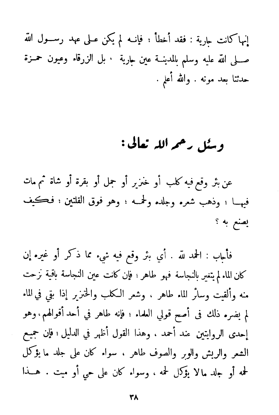 الْحَمْدُ لِلَّهِ، أَيُّ بِئْرٍ وَقَعَ فِيهِ شَيْءٌ مِمَّا ذُكِرَ أَوْ غَيْرُهُ إنْ كَانَ الْمَاءُ لَمْ يَتَغَيَّرْ بِالنَّجَاسَةِ فَهُوَ طَاهِرٌ؛ فَإِنْ كانت عَيْنُ النَّجَاسَةِ بَاقِيَةً نُزِحَتْ مِنْهُ وَأُلْقِيَتْ وَسَائِرُ الْمَاءِ طَاهِرٌ وَشَعْرُ الْكَلْبِ وَالْخِنْزِيرِ إذَا بَقِيَ فِي الْمَاءِ لَمْ يَضُرَّهُ ذَلِكَ فِي أَصَحِّ قَوْلَيْ الْعُلَمَاءِ: فَإِنَّهُ طَاهِرٌ فِي أَحَدِ أَقْوَالِهِمْ وَهُوَ إحْدَى الرِّوَايَتَيْنِ عِنْدَ أَحْمَد وَهَذَا الْقَوْلُ أَظْهَرُ فِي الدَّلِيلِ؛ فَإِنَّ جَمِيعَ الشَّعْرِ وَالرِّيشِ وَالْوَبَرِ وَالصُّوفِ طَاهِرٌ سَوَاءٌ كَانَ عَلَى جِلْدِ مَا يُؤْكَلُ لَحْمُهُ أَوْ جِلْدِ مَا لَا يُؤْكَلُ لَحْمُهُ وَسَوَاءٌ كَانَ عَلَى حَيٍّ أَوْ مَيِّتٍ. هَذَا