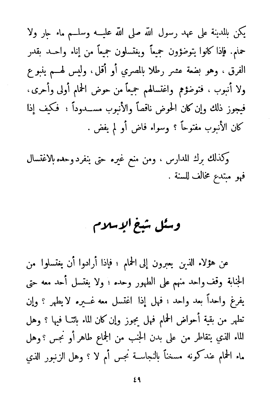 يَكُنْ بِالْمَدِينَةِ عَلَى عَهْدِ رَسُولِ اللَّهِ صَلَّى اللَّهُ عَلَيْهِ وَسَلَّمَ مَاءٌ جَارٍ وَلَا حَمَّامٌ} . فَإِذَا كَانُوا يَتَوَضَّئُونَ جَمِيعًا وَيَغْتَسِلُونَ جَمِيعًا مِنْ إنَاءٍ وَاحِدٍ بِقَدْرِ الْفَرْقِ وَهُوَ بِضْعَةَ عَشَرَ رِطْلًا بِالْمِصْرِيِّ أَوْ أَقَلُّ وَلَيْسَ لَهُمْ يَنْبُوعٌ وَلَا أُنْبُوبٌ فَتَوَضُّؤُهُمْ وَاغْتِسَالُهُمْ جَمِيعًا مِنْ حَوْضِ الْحَمَّامِ أَوْلَى وَأَحْرَى فَيَجُوزُ ذَلِكَ وَإِنْ كَانَ الْحَوْضُ نَاقِصًا وَالْأُنْبُوبُ مَسْدُودًا؛ فَكَيْفَ إذَا كَانَ الْأُنْبُوبُ مَفْتُوحًا؟ وَسَوَاءٌ فَاضَ أَوْ لَمْ يَفِضْ. وَكَذَلِكَ بِرَكُ الْمَدَارِسِ وَمَنْ مَنَعَ غَيْرَهُ حَتَّى يَنْفَرِدَ وَحْدَهُ بِالِاغْتِسَالِ فَهُوَ مُبْتَدِعٌ مُخَالِفٌ لَلسُّنَّةِ.