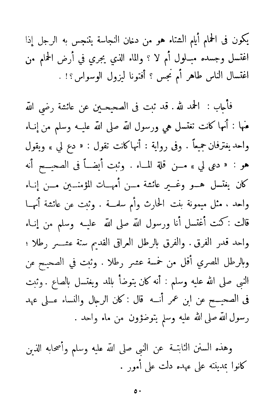الْحَمْدُ لِلَّهِ، قَدْ ثَبَتَ فِي الصَّحِيحَيْنِ عَنْ {عَائِشَةَ رَضِيَ اللَّهُ عَنْهَا أَنَّهَا كَانَتْ تَغْتَسِلُ هِيَ وَرَسُولُ اللَّهِ صَلَّى اللَّهُ عَلَيْهِ وَسَلَّمَ مِنْ إنَاءٍ وَاحِدٍ يَغْتَرِفَانِ جَمِيعًا} . وَفِي رِوَايَةٍ: إنَّهَا {كَانَتْ تَقُولُ: دَعْ لِي وَيَقُولُ هُوَ: دَعِي لِي} مِنْ قِلَّةِ الْمَاءِ. وَثَبَتَ أَيْضًا فِي الصَّحِيحِ {أَنَّهُ كَانَ يَغْتَسِلُ هُوَ وَغَيْرُ عَائِشَةَ مِنْ أُمَّهَاتِ الْمُؤْمِنِينَ مِنْ إنَاءٍ وَاحِدٍ مِثْلَ مَيْمُونَةَ بِنْتِ الْحَارِثِ وَأُمِّ سَلَمَةَ} . وَثَبَتَ عَنْ {عَائِشَةَ أَنَّهَا قَالَتْ: كُنْت أَغْتَسِلُ أَنَا وَرَسُولُ اللَّهِ صَلَّى اللَّهُ عَلَيْهِ وَسَلَّمَ مِنْ إنَاءٍ وَاحِدٍ قَدْرَ الْفَرَقِ} . وَالْفَرَقُ بِالرِّطْلِ الْعِرَاقِيِّ الْقَدِيمِ سِتَّةَ عَشَرَ رِطْلًا؛ وَبِالرِّطْلِ الْمِصْرِيِّ أَقَلُّ مِنْ خَمْسَةَ عَشَرَ رِطْلًا. وَثَبَتَ فِي الصَّحِيحِ عَنْ {النَّبِيِّ صَلَّى اللَّهُ عَلَيْهِ وَسَلَّمَ أَنَّهُ كَانَ يَتَوَضَّأُ بِالْمُدِّ وَيَغْتَسِلُ بِالصَّاعِ} . وَثَبَتَ فِي الصَّحِيحِ عَنْ ابْنِ عُمَرَ أَنَّهُ {قَالَ: كَانَ الرِّجَالُ وَالنِّسَاءُ عَلَى عَهْدِ رَسُولِ اللَّهِ صَلَّى اللَّهُ عَلَيْهِ وَسَلَّمَ يَتَوَضَّئُونَ مِنْ مَاءٍ وَاحِدٍ} . وَهَذِهِ السُّنَنُ الثَّابِتَةُ عَنْ النَّبِيِّ صَلَّى اللَّهُ عَلَيْهِ وَسَلَّمَ وَأَصْحَابِهِ الَّذِينَ كَانُوا بِمَدِينَتِهِ عَلَى عَهْدِهِ دَلَّتْ عَلَى أُمُورٍ.