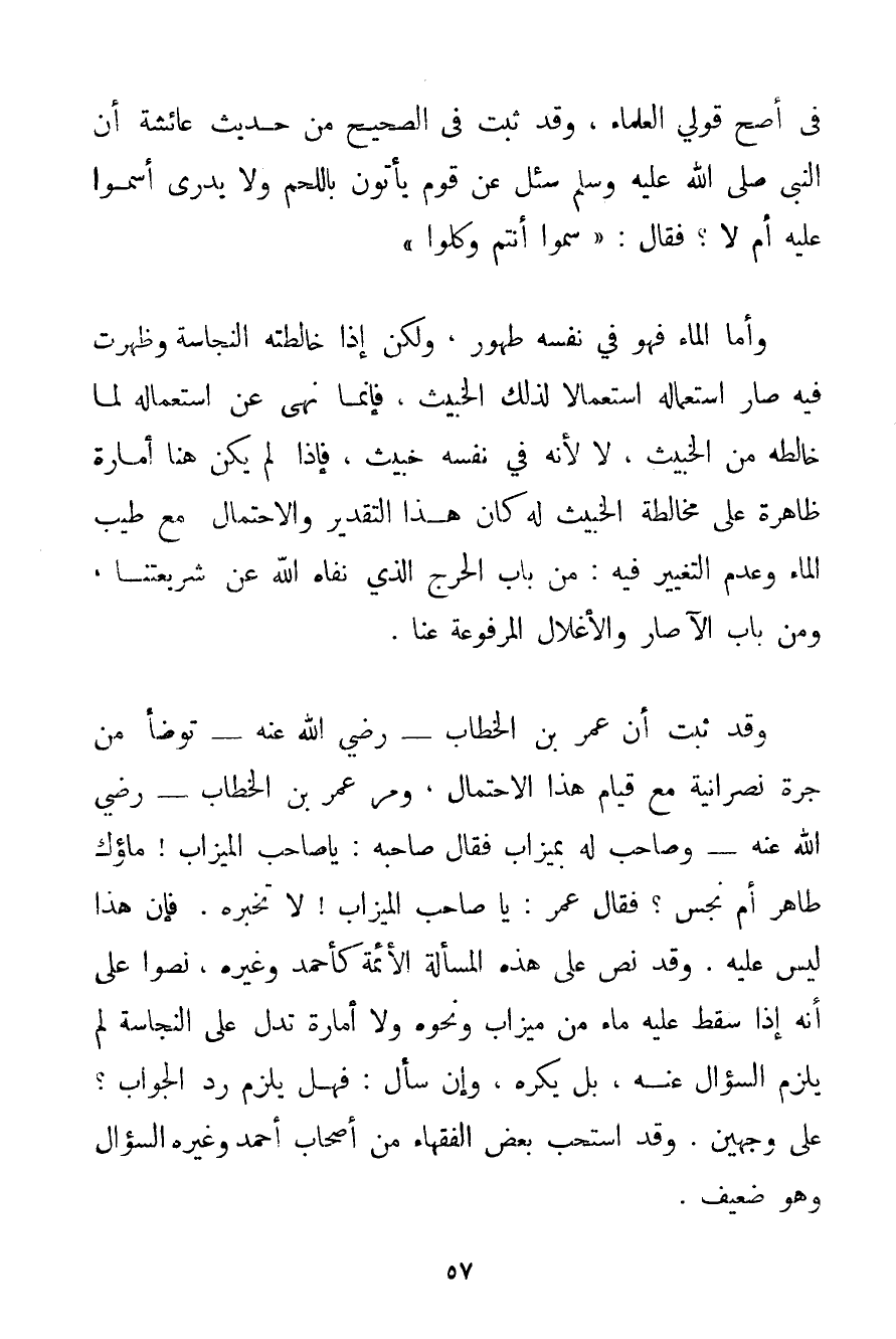 وَأَمَّا الْمَاءُ فَهُوَ فِي نَفْسِهِ طَهُورٌ وَلَكِنْ إذَا خَالَطَتْهُ النَّجَاسَةُ وَظَهَرَتْ فِيهِ صَارَ اسْتِعْمَالُهُ اسْتِعْمَالًا لِذَلِكَ الْخَبِيثِ فَإِنَّمَا نُهِيَ عَنْ اسْتِعْمَالِهِ لِمَا خَالَطَهُ مِنْ الْخَبِيثِ لَا لِأَنَّهُ فِي نَفْسِهِ خَبِيثٌ فَإِذَا لَمْ يَكُنْ هُنَا أَمَارَةٌ ظَاهِرَةٌ عَلَى مُخَالَطَةِ الْخَبِيثِ لَهُ كَانَ هَذَا التَّقْدِيرُ وَالِاحْتِمَالُ مَعَ طِيبِ الْمَاءِ وَعَدَمِ التَّغْيِيرِ فِيهِ: مِنْ بَابِ الْحَرَجِ الَّذِي نَفَاهُ اللَّهُ عَنْ شَرِيعَتِنَا وَمِنْ بَابِ الْآصَارِ وَالْأَغْلَالِ الْمَرْفُوعَةِ عَنَّا. وَقَدْ ثَبَتَ أَنَّ عُمَرَ بْنَ الْخَطَّابِ - رَضِيَ اللَّهُ عَنْهُ - تَوَضَّأَ مِنْ جَرَّةِ نَصْرَانِيَّةٍ مَعَ قِيَامِ هَذَا الِاحْتِمَالِ وَمَرَّ عُمَرُ بْنُ الْخَطَّابِ - رَضِيَ اللَّهُ عَنْهُ - وَصَاحِبٌ لَهُ بِمِيزَابِ فَقَالَ صَاحِبُهُ: يَا صَاحِبَ الْمِيزَابِ مَاؤُك طَاهِرٌ أَمْ نَجِسٌ؟ فَقَالَ عُمَرُ: يَا صَاحِبَ الْمِيزَابِ لَا تُخْبِرْهُ. فَإِنَّ هَذَا لَيْسَ عَلَيْهِ. وَقَدْ نَصَّ عَلَى هَذِهِ الْمَسْأَلَةِ الْأَئِمَّةُ كَأَحْمَدَ وَغَيْرِهِ نَصُّوا عَلَى أَنَّهُ إذَا سَقَطَ عَلَيْهِ مَاءٌ مِنْ مِيزَابٍ وَنَحْوِهِ وَلَا أَمَارَةَ تَدُلُّ عَلَى النَّجَاسَةِ لَمْ يَلْزَمْ السُّؤَالُ عَنْهُ بَلْ يُكْرَهُ وَإِنْ سَأَلَ: فَهَلْ يَلْزَمُ رَدُّ الْجَوَابِ؟ عَلَى وَجْهَيْنِ. وَقَدْ اسْتَحَبَّ بَعْضُ الْفُقَهَاءِ مِنْ أَصْحَابِ أَحْمَد وَغَيْرِهِ السُّؤَالَ وَهُوَ ضَعِيفٌ.