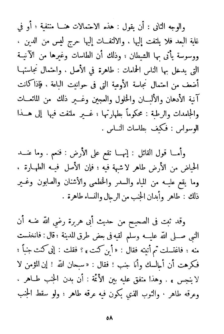 وَالْوَجْهُ الثَّانِي: أَنْ يَقُولَ: هَذِهِ الِاحْتِمَالَاتُ هُنَا مُنْتَفِيَةٌ؛ أَوْ فِي غَايَةِ الْبُعْدِ فَلَا يُلْتَفَتُ إلَيْهَا وَالِالْتِفَاتُ إلَيْهَا حَرَجٌ لَيْسَ مِنْ الدِّينِ وَوَسْوَسَةٌ يَأْتِي بِهَا الشَّيْطَانُ؛ وَذَلِكَ أَنَّ الطَّاسَاتِ وَغَيْرَهَا مِنْ الْآنِيَةِ الَّتِي يَدْخُلُ بِهَا النَّاسُ الْحَمَّامَاتِ: طَاهِرَةٌ فِي الْأَصْلِ وَاحْتِمَالُ نَجَاسَتِهَا أَضْعَفُ مِنْ احْتِمَالِ نَجَاسَةِ الْأَوْعِيَةِ الَّتِي فِي حَوَانِيتِ الْبَاعَةِ فَإِذَا كَانَتْ آنِيَةُ الْأَدْهَانِ وَالْأَلْبَانِ وَالْخُلُولِ وَالْعَجِينِ وَغَيْرِ ذَلِكَ مِنْ الْمَائِعَاتِ وَالْجَامِدَاتِ وَالرَّطْبَةِ: مَحْكُومًا بِطَهَارَتِهَا؛ غَيْرُ مُلْتَفَتٍ فِيهَا إلَى هَذَا الْوَسْوَاسِ: فَكَيْفَ بِطَاسَاتِ النَّاسِ. وَأَمَّا قَوْلُ الْقَائِلِ: إنَّهَا تَقَعُ عَلَى الْأَرْضِ: فَنَعَمْ. وَمَا عِنْدَ الْحِيَاضِ مِنْ الْأَرْضِ طَاهِرٌ لَا شُبْهَةَ فِيهِ؛ فَإِنَّ الْأَصْلَ فِيهِ الطَّهَارَةُ وَمَا يَقَعُ عَلَيْهِ مِنْ الْمِيَاهِ وَالسِّدْرِ والخطمي وَالْأُشْنَانِ وَالصَّابُونِ وَغَيْرِ ذَلِكَ: طَاهِرٌ وَأَبْدَانُ الْجُنُبِ مِنْ الرِّجَالِ وَالنِّسَاءِ طَاهِرَةٌ. وَقَدْ ثَبَتَ فِي الصَّحِيحِ مِنْ حَدِيثِ {أَبِي هُرَيْرَةَ رَضِيَ اللَّهُ عَنْهُ أَنَّ النَّبِيَّ صَلَّى اللَّهُ عَلَيْهِ وَسَلَّمَ لَقِيَهُ فِي بَعْضِ طُرُقِ الْمَدِينَةِ؛ قَالَ: فَانْخَنَسْت مِنْهُ؛ فَاغْتَسَلْت ثُمَّ أَتَيْته فَقَالَ: أَيْنَ كُنْت؟ فَقُلْت: إنِّي كُنْت جُنُبًا؛ فَكَرِهْت أَنْ أُجَالِسَك وَأَنَا جُنُبٌ فَقَالَ: سُبْحَانَ اللَّهِ إنَّ الْمُؤْمِنَ لَا يَنْجُسُ} . وَهَذَا مُتَّفَقٌ عَلَيْهِ بَيْنَ الْأَئِمَّةِ: أَنَّ بَدَنَ الْجُنُبِ طَاهِرٌ وَعَرَقُهُ طَاهِرٌ وَالثَّوْبَ الَّذِي يَكُونُ فِيهِ عَرَقُهُ طَاهِرٌ؛ وَلَوْ سَقَطَ الْجُنُبُ