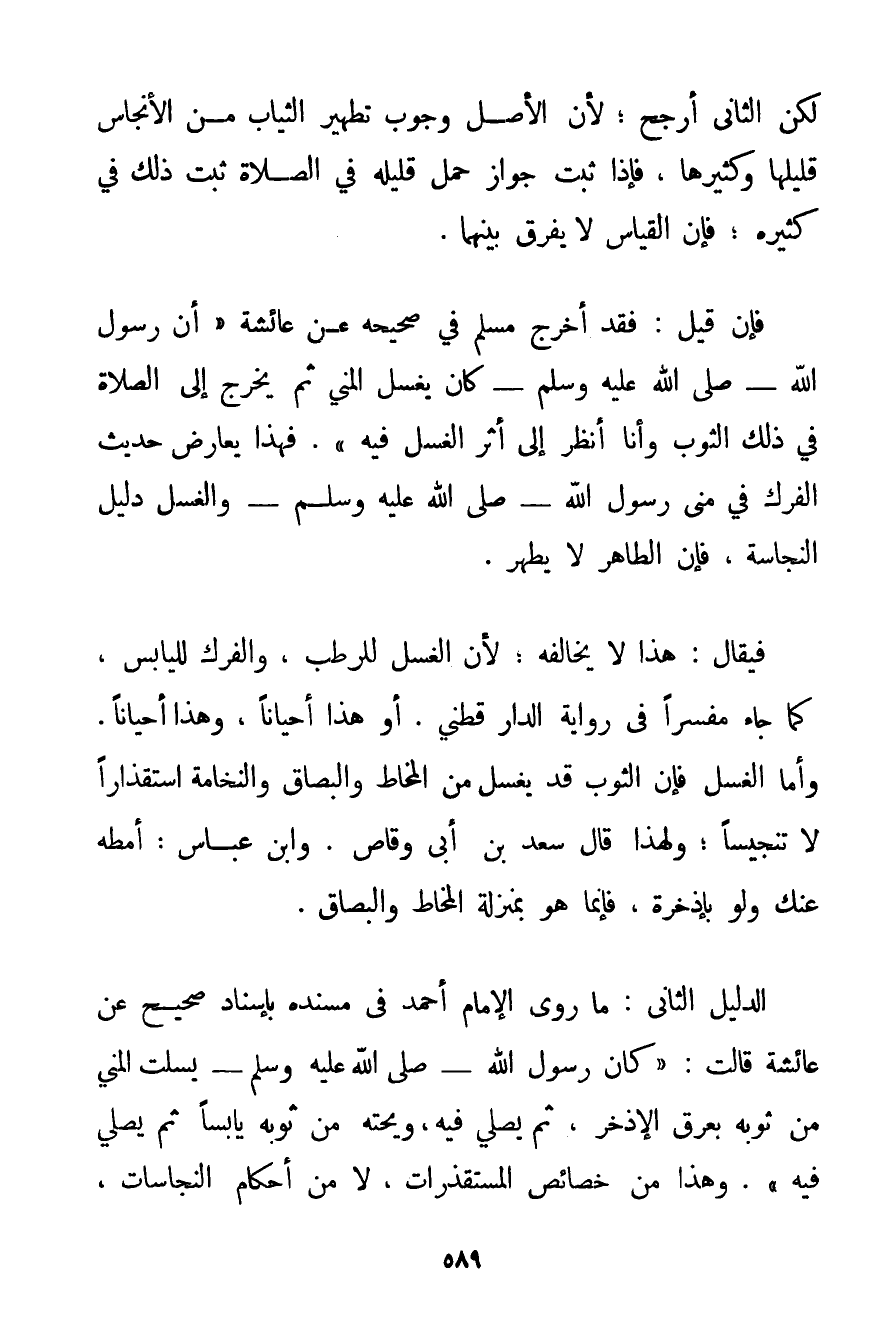 لَكِنَّ الثَّانِيَ أَرْجَحُ؛ لِأَنَّ الْأَصْلَ وُجُوبُ تَطْهِيرِ الثِّيَابِ مِنْ الْأَنْجَاسِ قَلِيلِهَا وَكَثِيرِهَا فَإِذَا ثَبَتَ جَوَازُ حَمْلِ قَلِيلِهِ فِي الصَّلَاةِ ثَبَتَ ذَلِكَ فِي كَثِيرِهِ؛ فَإِنَّ الْقِيَاسَ لَا يُفَرِّقُ بَيْنَهُمَا. فَإِنْ قِيلَ: فَقَدْ أَخْرَجَ مُسْلِمٌ فِي صَحِيحِهِ عَنْ عَائِشَةَ {أَنَّ رَسُولَ اللَّهِ - صَلَّى اللَّهُ عَلَيْهِ وَسَلَّمَ - كَانَ يَغْسِلُ الْمَنِيَّ ثُمَّ يَخْرُجُ إلَى الصَّلَاةِ فِي ذَلِكَ الثَّوْبِ وَأَنَا أَنْظُرُ إلَى أَثَرِ الْغُسْلِ فِيهِ} . فَهَذَا يُعَارِضُ حَدِيثَ الْفَرْكِ فِي مَنِيِّ رَسُولِ اللَّهِ - صَلَّى اللَّهُ عَلَيْهِ وَسَلَّمَ - وَالْغَسْلُ دَلِيلُ النَّجَاسَةِ فَإِنَّ الطَّاهِرَ لَا يَطْهُرُ. فَيُقَالُ: هَذَا لَا يُخَالِفُهُ؛ لِأَنَّ الْغَسْلَ لِلرَّطْبِ وَالْفَرْكَ لِلْيَابِسِ كَمَا جَاءَ مُفَسَّرًا فِي رِوَايَةِ الدارقطني. أَوْ هَذَا أَحْيَانًا وَهَذَا أَحْيَانًا. وَأَمَّا الْغَسْلُ فَإِنَّ الثَّوْبَ قَدْ يُغْسَلُ مِنْ الْمُخَاطِ وَالْبُصَاقِ وَالنُّخَامَةِ اسْتِقْذَارًا لَا تَنْجِيسًا؛ وَلِهَذَا قَالَ سَعْدُ بْنُ أَبِي وَقَّاصٍ. وَابْنُ عَبَّاسٍ: أَمِطْهُ عَنْك وَلَوْ بإذخرة فَإِنَّمَا هُوَ بِمَنْزِلَةِ الْمُخَاطِ وَالْبُصَاقِ. الدَّلِيلُ الثَّانِي: مَا رَوَى الْإِمَامُ أَحْمَدُ فِي مَسْنَدِهِ بِإِسْنَادِ صَحِيحٍ عَنْ عَائِشَةَ قَالَتْ: {كَانَ رَسُولُ اللَّهِ - صَلَّى اللَّهُ عَلَيْهِ وَسَلَّمَ يَسْلِتُ الْمَنِيَّ مِنْ ثَوْبِهِ بِعِرْقِ الْإِذْخِرِ ثُمَّ يُصَلِّي فِيهِ وَيَحُتُّهُ مِنْ ثَوْبِهِ يَابِسًا ثُمَّ يُصَلِّي فِيهِ} . وَهَذَا مِنْ خَصَائِصِ الْمُسْتَقْذَرَاتِ لَا مِنْ أَحْكَامِ النَّجَاسَاتِ