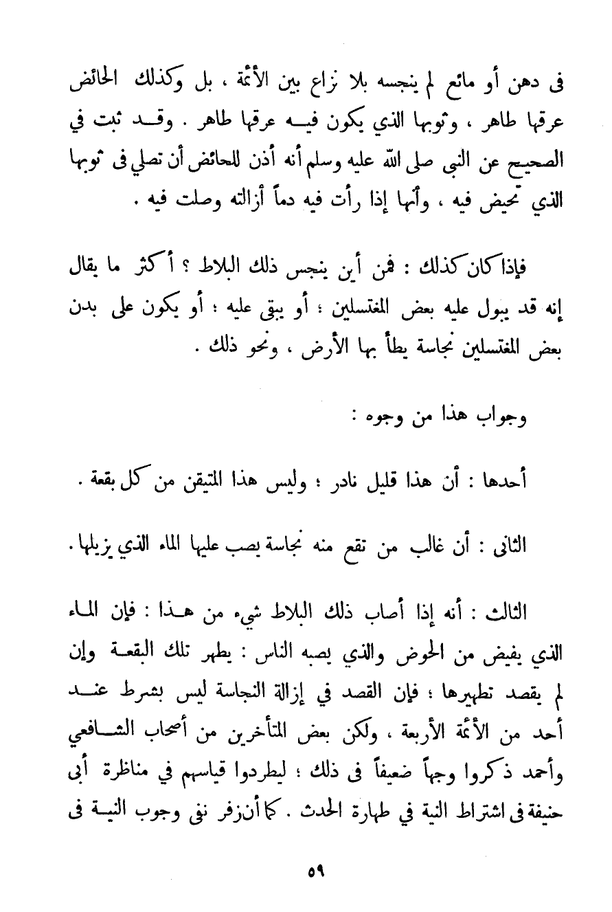 فِي دُهْنٍ أَوْ مَائِعٍ لَمْ يُنَجِّسْهُ بِلَا نِزَاعٍ بَيْنَ الْأَئِمَّةِ بَلْ وَكَذَلِكَ الْحَائِضُ عَرَقُهَا طَاهِرٌ وَثَوْبُهَا الَّذِي يَكُونُ فِيهِ عَرَقُهَا طَاهِرٌ. وَقَدْ ثَبَتَ فِي الصَّحِيحِ عَنْ {النَّبِيِّ صَلَّى اللَّهُ عَلَيْهِ وَسَلَّمَ أَنَّهُ أَذِنَ لِلْحَائِضِ أَنْ تُصَلِّيَ فِي ثَوْبِهَا الَّذِي تَحِيضُ فِيهِ وَأَنَّهَا إذَا رَأَتْ فِيهِ دَمًا أَزَالَتْهُ وَصَلَّتْ فِيهِ} . فَإِذَا كَانَ كَذَلِكَ: فَمِنْ أَيْنَ يَنْجُسُ ذَلِكَ الْبَلَاطُ؟ أَكْثَرُ مَا يُقَالُ إنَّهُ قَدْ يَبُولُ عَلَيْهِ بَعْضُ الْمُغْتَسِلِينَ؛ أَوْ يَبْقَى عَلَيْهِ؛ أَوْ يَكُونُ عَلَى بَدَنِ بَعْضِ الْمُغْتَسِلِينَ نَجَاسَةٌ يَطَأُ بِهَا الْأَرْضَ وَنَحْوَ ذَلِكَ. وَجَوَابُ هَذَا مِنْ وُجُوهٍ: أَحَدُهَا: أَنَّ هَذَا قَلِيلٌ نَادِرٌ؛ وَلَيْسَ هَذَا الْمُتَيَقَّنُ مِنْ كُلِّ بُقْعَةٍ. الثَّانِي: أَنَّ غَالِبَ مَنْ تَقَعُ مِنْهُ نَجَاسَةٌ يَصُبُّ عَلَيْهَا الْمَاءَ الَّذِي يُزِيلُهَا. الثَّالِثُ: أَنَّهُ إذَا أَصَابَ ذَلِكَ الْبَلَاطَ شَيْءٌ مِنْ هَذَا: فَإِنَّ الْمَاءَ الَّذِي يَفِيضُ مِنْ الْحَوْضِ وَاَلَّذِي يَصُبُّهُ النَّاسُ: يُطَهِّرُ تِلْكَ الْبُقْعَةَ وَإِنْ لَمْ يَقْصِدْ تَطْهِيرَهَا؛ فَإِنَّ الْقَصْدَ فِي إزَالَةِ النَّجَاسَةِ لَيْسَ بِشَرْطِ عِنْدَ أَحَدٍ مِنْ الْأَئِمَّةِ الْأَرْبَعَةِ وَلَكِنَّ بَعْضَ الْمُتَأَخِّرِينَ مِنْ أَصْحَابِ الشَّافِعِيِّ وَأَحْمَد ذَكَرُوا وَجْهًا ضَعِيفًا فِي ذَلِكَ؛ لِيَطْرُدُوا قِيَاسَهُمْ فِي مُنَاظَرَةِ أَبِي حَنِيفَةَ فِي اشْتِرَاطِ النِّيَّةِ فِي طَهَارَةِ الْحَدَثِ. كَمَا أَنَّ زُفَرَ نَفَى وُجُوبَ النِّيَّةِ فِي