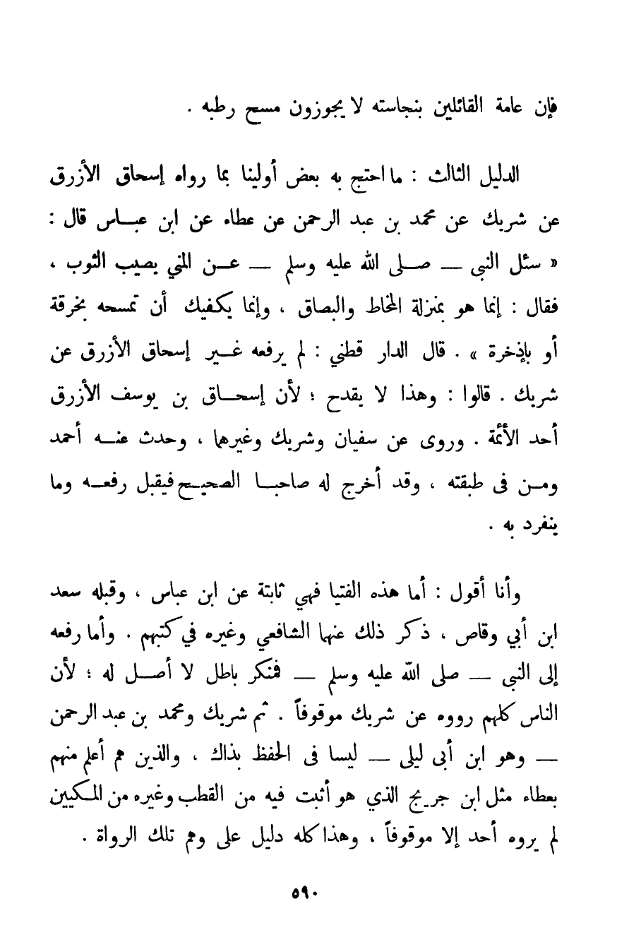 فَإِنَّ عَامَّةَ الْقَائِلِينَ بِنَجَاسَتِهِ لَا يُجَوِّزُونَ مَسْحَ رَطْبِهِ. الدَّلِيلُ الثَّالِثُ: مَا احْتَجَّ بِهِ بَعْضُ أَوَّلِينَا بِمَا رَوَاهُ إسْحَاقُ الْأَزْرَقُ عَنْ شَرِيكٍ عَنْ مُحَمَّدِ بْنِ عَبْدِ الرَّحْمَنِ عَنْ عَطَاءٍ عَنْ ابْنِ عَبَّاسٍ قَالَ: {سُئِلَ النَّبِيُّ - صَلَّى اللَّهُ عَلَيْهِ وَسَلَّمَ - عَنْ الْمَنِيِّ يُصِيبُ الثَّوْبَ فَقَالَ: إنَّمَا هُوَ بِمَنْزِلَةِ الْمُخَاطِ وَالْبُصَاقِ وَإِنَّمَا يَكْفِيك أَنْ تَمْسَحَهُ بِخِرْقَةِ أَوْ بإذخرة} . قَالَ الدارقطني: لَمْ يَرْفَعْهُ غَيْرُ إسْحَاقَ الْأَزْرَقِ عَنْ شَرِيكٍ. قَالُوا: وَهَذَا لَا يَقْدَحُ؛ لِأَنَّ إسْحَاقَ بْنَ يُوسُفَ الْأَزْرَقَ أَحَدُ الْأَئِمَّةِ. وَرَوَى عَنْ سُفْيَانَ وَشَرِيكٍ وَغَيْرِهِمَا وَحَدَّثَ عَنْهُ أَحْمَدُ وَمِنْ فِي طَبَقَتِهِ وَقَدْ أَخْرَجَ لَهُ صَاحِبَا الصَّحِيحِ فَيُقْبَلُ رَفْعُهُ وَمَا يَنْفَرِدُ بِهِ. وَأَنَا أَقُولُ: أَمَّا هَذِهِ الْفُتْيَا فَهِيَ ثَابِتَةٌ عَنْ ابْنِ عَبَّاسٍ وَقَبْلَهُ سَعْدُ بْنُ أَبِي وَقَّاصٍ ذَكَرَ ذَلِكَ عَنْهُمَا الشَّافِعِيُّ وَغَيْرُهُ فِي كُتُبِهِمْ. وَأَمَّا رَفْعُهُ إلَى النَّبِيِّ - صَلَّى اللَّهُ عَلَيْهِ وَسَلَّمَ - فَمُنْكَرٌ بَاطِلٌ لَا أَصْل لَهُ؛ لِأَنَّ النَّاسَ كُلَّهُمْ رَوَوْهُ عَنْ شَرِيكٍ مَوْقُوفًا. ثُمَّ شَرِيكٌ وَمُحَمَّدُ بْنُ عَبْدِ الرَّحْمَنِ - وَهُوَ ابْنُ أَبِي لَيْلَى - لَيْسَا فِي الْحِفْظِ بِذَاكَ وَاَلَّذِينَ هُمْ أَعْلَمُ مِنْهُمْ بِعَطَاءِ مَثَلُ ابْنِ جريج الَّذِي هُوَ أَثْبَتُ فِيهِ مِنْ الْقُطْبِ وَغَيْرِهِ مِنْ الْمَكِّيِّينَ لَمْ يَرْوِهِ أَحَدٌ إلَّا مَوْقُوفًا وَهَذَا كُلُّهُ دَلِيلٌ عَلَى وَهْمِ تِلْكَ الرُّوَاةِ.