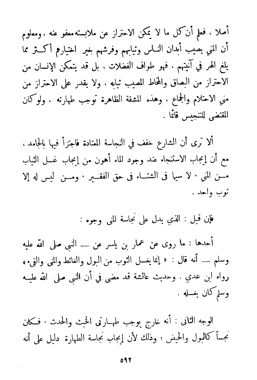 أَصْلًا فَعُلِمَ أَنَّ كُلَّ مَا لَا يُمْكِنُ الِاحْتِرَازُ عَنْ مُلَابَسَتِهِ مَعْفُوٌّ عَنْهُ وَمَعْلُومٌ أَنَّ الْمَنِيَّ يُصِيبُ أَبْدَانَ النَّاسِ وَثِيَابَهُمْ وَفُرُشَهُمْ بِغَيْرِ اخْتِيَارِهِمْ أَكْثَرَ مِمَّا يَلَغُ الْهِرُّ فِي آنِيَتِهِمْ فَهُوَ طَوَافُ الْفَضَلَاتِ بَلْ قَدْ يَتَمَكَّنُ الْإِنْسَانُ مِنْ الِاحْتِرَازِ مِنْ الْبُصَاقِ وَالْمُخَاطِ الْمُصِيبِ ثِيَابَهُ وَلَا يَقْدِرُ عَلَى الِاحْتِرَازِ مِنْ مَنِيِّ الِاحْتِلَامِ وَالْجِمَاعِ وَهَذِهِ الْمَشَقَّةُ الظَّاهِرَةُ تُوجِبُ طَهَارَتَهُ وَلَوْ كَانَ الْمُقْتَضِي لِلتَّنْجِيسِ قَائِمًا. أَلَا تَرَى أَنَّ الشَّارِعَ خَفَّفَ فِي النَّجَاسَةِ الْمُعْتَادَةِ فَاجْتَزَأَ فِيهَا بِالْجَامِدِ مَعَ أَنَّ إيجَابَ الِاسْتِنْجَاءِ عِنْدَ وُجُودِ الْمَاءِ أَهْوَنُ مِنْ إيجَابِ غَسْلِ الثِّيَابِ مِنْ الْمَنِيِّ لَا سِيَّمَا فِي الشِّتَاءِ فِي حَقِّ الْفَقِيرِ وَمَنْ لَيْسَ لَهُ إلَّا ثَوْبٌ وَاحِدٌ. فَإِنْ قِيلَ: الَّذِي يَدُلُّ عَلَى نَجَاسَةِ الْمَنِيِّ وُجُوهٌ: أَحَدُهَا: مَا رُوِيَ عَنْ عَمَّارِ بْنِ يَاسِرٍ عَنْ - النَّبِيِّ صَلَّى اللَّهُ عَلَيْهِ وَسَلَّمَ - أَنَّهُ قَالَ: {إنَّمَا يُغْسَلُ الثَّوْبُ مِنْ الْبَوْلِ وَالْغَائِطِ وَالْمَنِيِّ وَالْقَيْءِ} رَوَاهُ ابْنُ عَدِيٍّ. وَحَدِيثُ عَائِشَةَ قَدْ مَضَى فِي أَنَّ النَّبِيَّ صَلَّى اللَّهُ عَلَيْهِ وَسَلَّمَ كَانَ يَغْسِلُهُ. الْوَجْهُ الثَّانِي: أَنَّهُ خَارِجٌ يُوجِبُ طَهَارَتَيْ الْخَبَثِ وَالْحَدَثِ فَكَانَ نَجِسًا كَالْبَوْلِ وَالْحَيْضِ؛ وَذَلِكَ لِأَنَّ إيجَابَ نَجَاسَةِ الطَّهَارَةِ دَلِيلٌ عَلَى أَنَّهُ